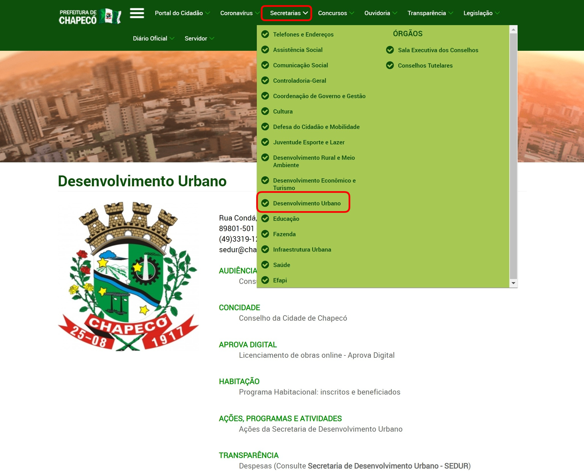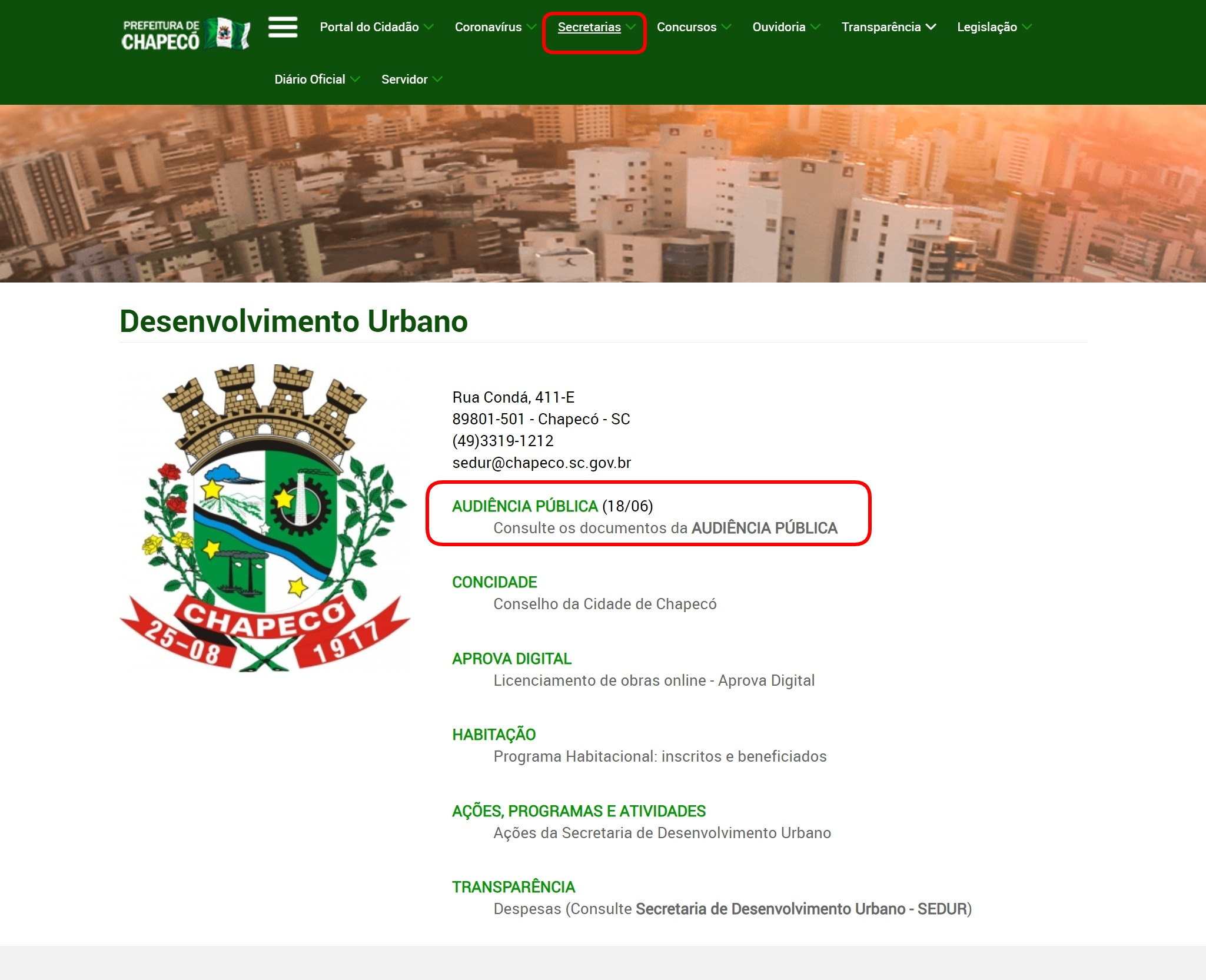 O material para consulta está disponível na página eletrônica do Município no endereço www.chapeco.sc.gov.br (menu `secretarias`, `Secretaria de Desenvolvimento Urbano`) desde o dia 04 de junho.