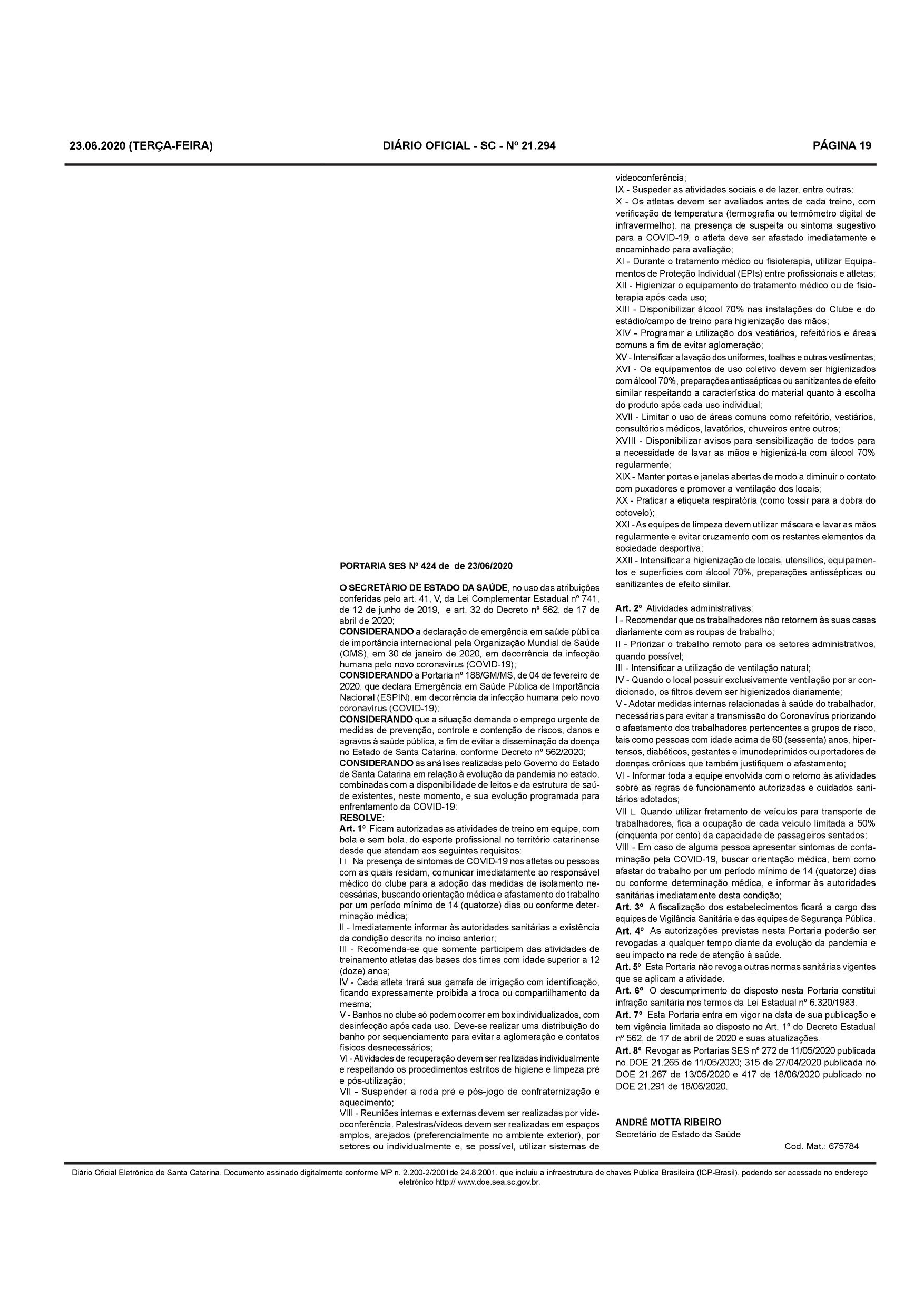CONSIDERANDO a revogação da Portaria SES nº. 417, de 18 de junho de 2020, que autorizava a realização de atividades para treino com bola do esporte profissional e amador no território catarinense, pela Portaria SES nº. 424, de 23 de junho de 2020, publicada no Diário Oficial do Estado de Santa Catarina - DOE nº. 21.294, de 23 de junho de 2020.