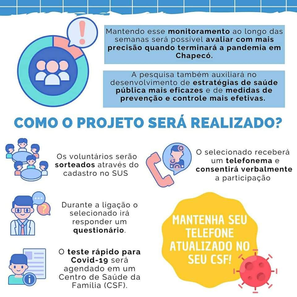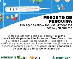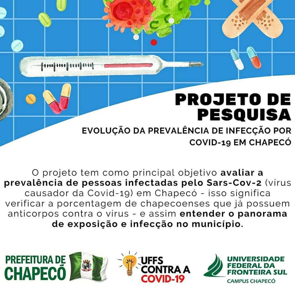 Chapecó, 15/07/2020, quarta-feira Com o objetivo de descobrir a porcentagem da população chapecoense que já tem anticorpos contra o coronavírus, os técnicos da saúde de Chapecó estão realizando uma pesquisa. É mais uma ação para o combate à pandemia de coronavírus, realizada em parceria com a Secretaria de Saúde de Chapecó e a Universidade Federal da Fronteira Sul (UFFS). O objetivo deste levantamento é avaliar a soroprevalência de infecção pelo SARS-CoV-2 no município de Chapecó, Santa Catarina através de teste rápido imunocromatográfico.