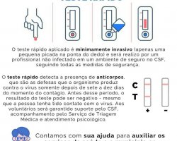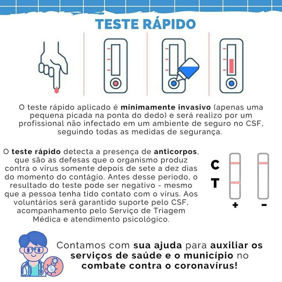 Para a coleta do teste rápido, será realizada uma picada na ponta de um dedo para coletar uma gota de sangue. O resultado do teste fica pronto em até 15 minutos. A atividade de testagem, tem como intenção ampliar os serviços já ofertados, assim como, dar maior segurança para a tomada de decisões que envolvem o retorno de atividades cotidianas da população.
