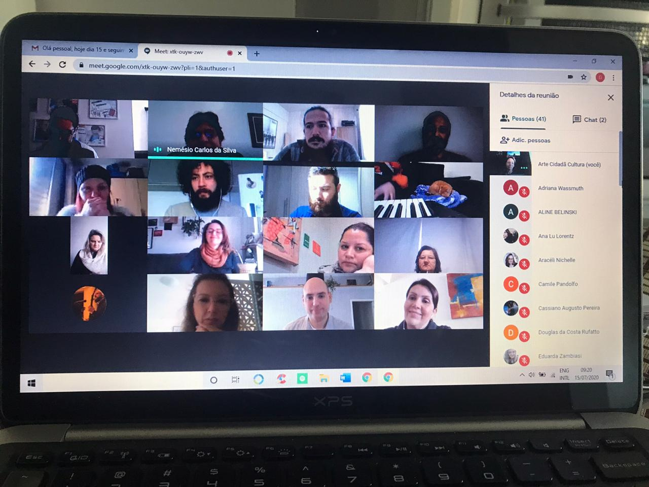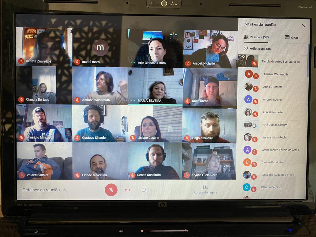 Chapecó, 16/07/2020, quinta-feira Os professores da área cultural de Chapecó e que atuam na Escola de Artes e no Programa Arte Cidadã participaram da Semana de Reflexões Formação Online da SECUL Secretaria de Cultura, que aconteceu entre os dias 14 e 16 de julho. É uma semana para refletir sobre a importância, função social e humana da arte e da cultura (música, teatro, dança e artes visuais) nos tempos de pandemia.