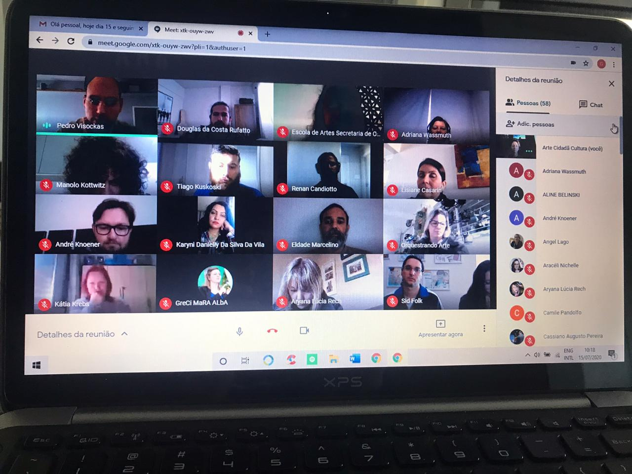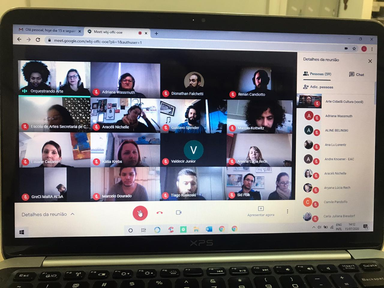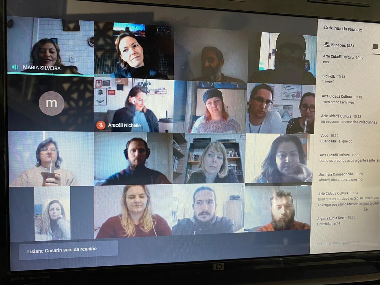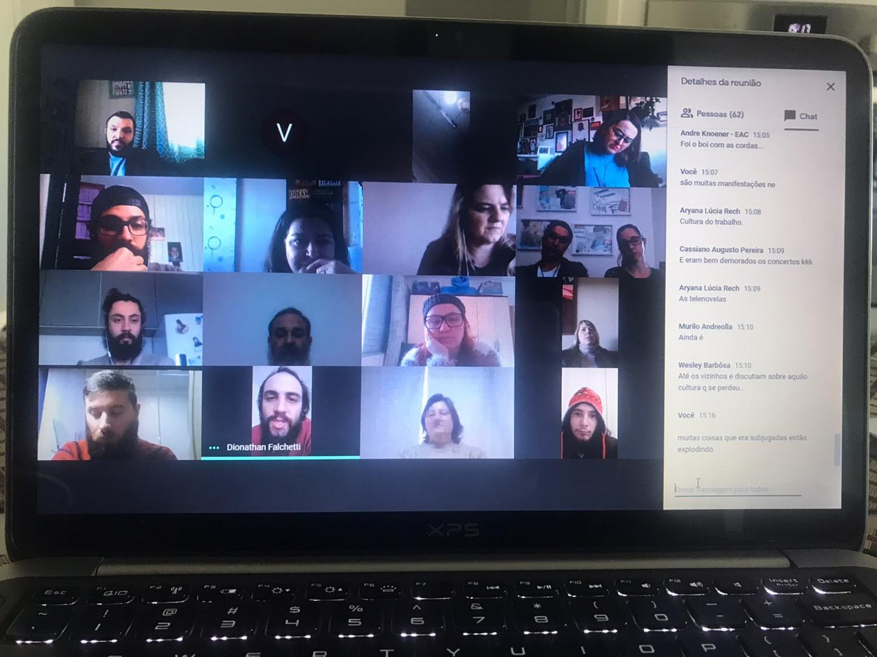 Participam da formação mais de 60 pessoas, entre palestrantes parceiros, professores dos espaços de formação da Secul, equipe administrativa e estagiários, além de servidores de outros setores da cultura. Estamos nos fortalecendo entre si enquanto profissionais frente aos desafios, dificuldades e oportunidades que o ensino remoto vem nos mostrando.