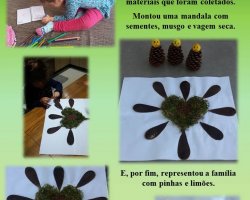Com as crianças Bem Pequenas foi encaminhado que a família convidasse a criança para passear em algum lugar próximo a sua casa, no quintal, conforme suas possibilidades e mantendo as medidas de segurança. Durante o passeio, a família incentivou a criança a observar a paisagem, o percurso, conversando com ela sobre suas percepções e também para que a criança recolha alguns elementos naturais (pedrinhas, gravetos, folhas, sementes) que encontrar pelo caminho. Após chegar em casa, indagar a criança sobre o que observou, quais sensações teve, quais materiais encontrou e registrar essa observação através de desenho e na sequencia fazer uma criação artística como: bonecos (representando a família) e animais de graveto, casinha com as pedras, mandalas com sementes, folhas, deixando a criança expressar-se de forma livre.
