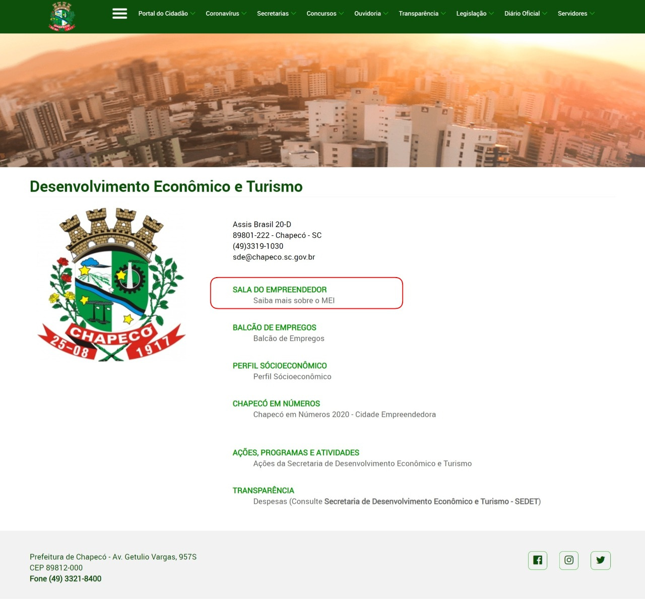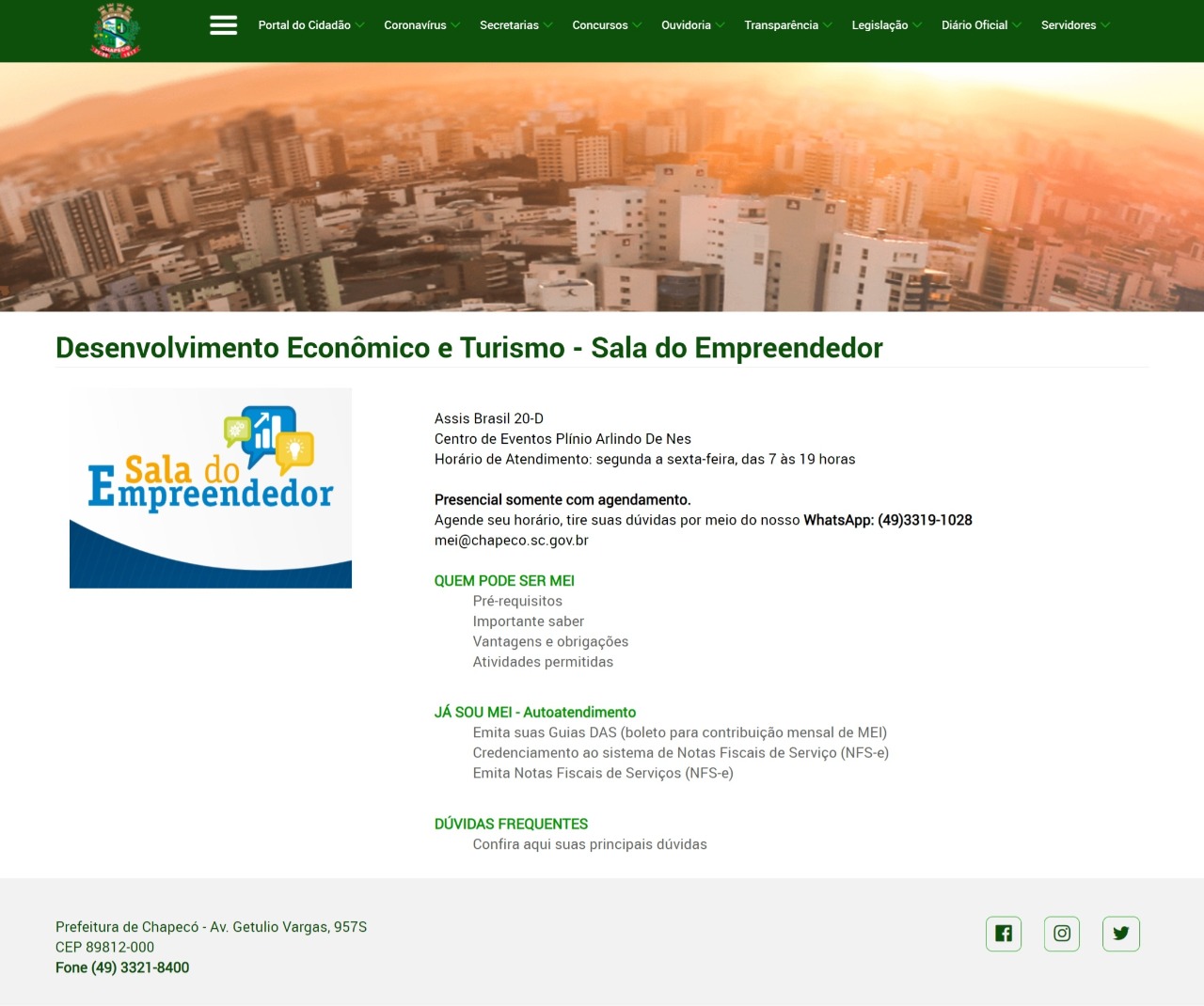 A proposta estava em elaboração desde de agosto deste ano e foi fomentada após o município receber os resultados da Pesquisa de Satisfação do Atendimento da Sala do Empreendedor de Chapecó, realizada pelo Sebrae/SC. O último levantamento de cliente oculto revelou que o único ponto negativo do atendimento remoto aos empresários e para quem deseja empreender era a ausência de um local virtual que centralizasse todas as informações sobre MEI. Imediatamente começamos a trabalhar nessa plataforma dentro do site da Administração Municipal para centralizar todas as informações, explica o secretário de Desenvolvimento Econômico e Turismo, Arthur Badalotti Smaniotto.
