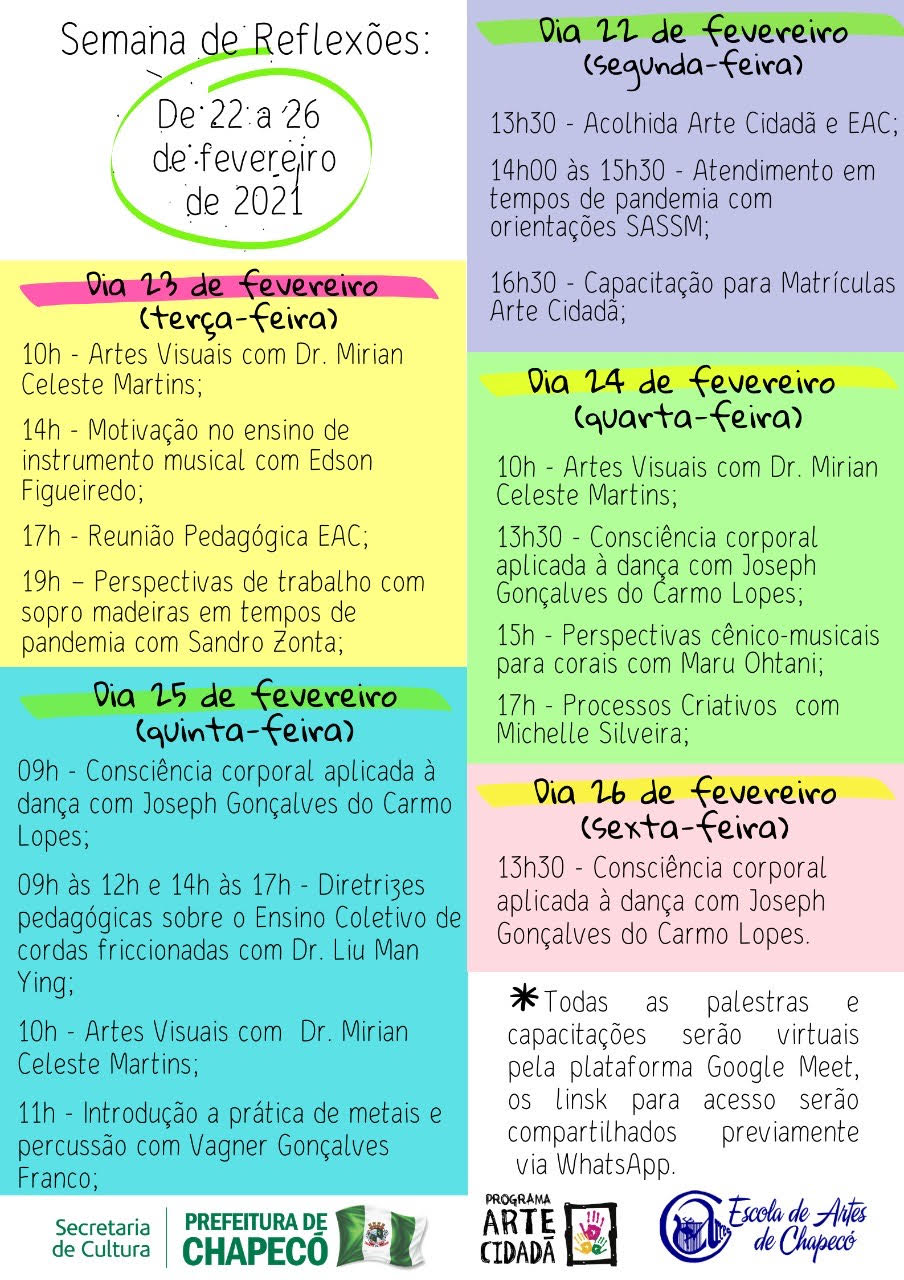 O programa Arte Cidadã e a Escola de Artes de Chapecó realizam, entre os dias 22 e 26 de março, a Semana de Reflexões. Processo formativo interno com professores, monitores, técnicos, estagiários e auxiliares das áreas administrativas, música, teatro, dança, artes visuais, coordenações e secretarias.