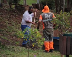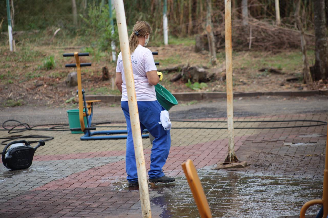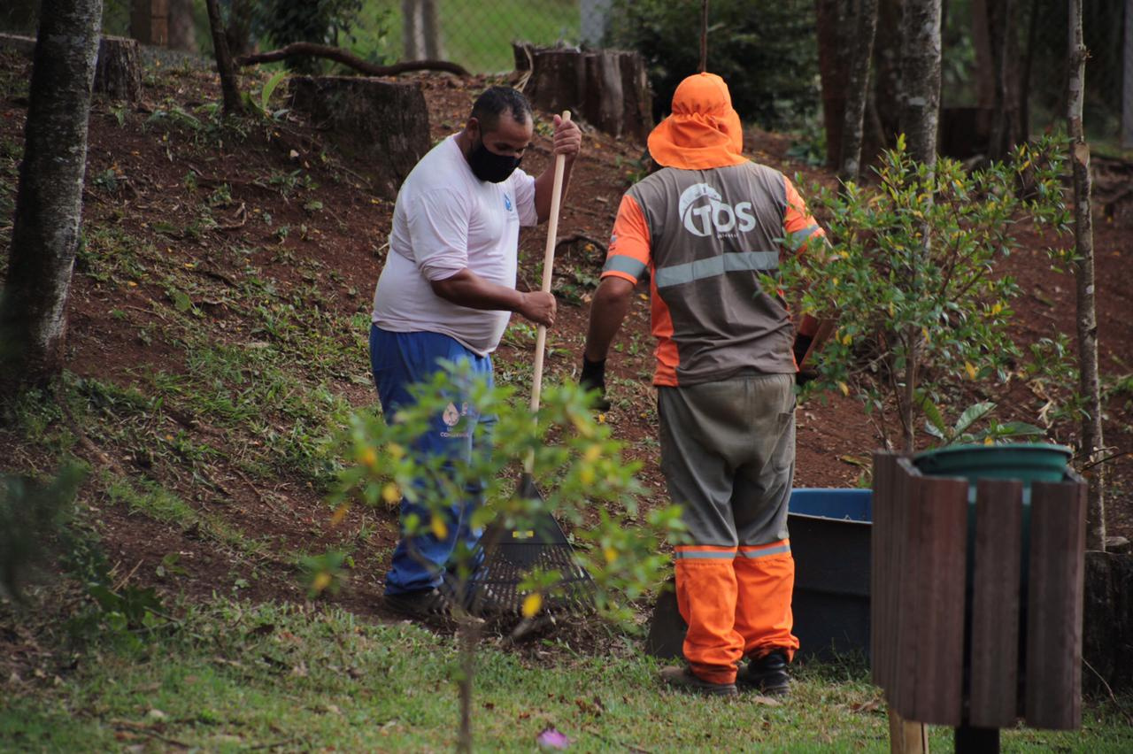 De acordo com a assessora da secretaria, Margarete Farezin, as equipes estão fazendo a capina, corte de grama, retirada do mato, galhos, poda e também a recuperação da pista de caminhada, tapando as valetas feitas pela água e repondo o pedrisco.