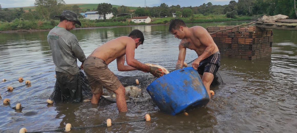 O piscicultor Rafael Barp, da Linha Simonetto, é a terceira geração da família na atividade. Ele já retirou os peixes de um açude maior, para um tanque menor, para facilitar a retirada. Ele vai comercializar seus peixes nos pontos de feira do São Cristóvão, Calçadão.