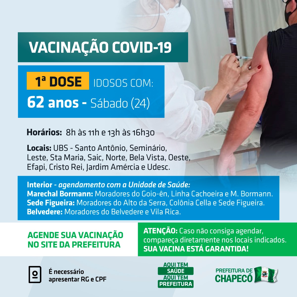 A vacinação da primeira dose da vacina contra a Covid , para quem tem 62 anos completos, será neste sábado. O agendamento está disponível no site da Prefeitura (www.chapeco.sc.gov.br). Quem não conseguir agendar pode pedir auxílio para um familiar, vizinho ou amigo ou na unidade básica de saúde para agendamento. Em último caso pode ir direto. O objetivo do agendamento é evitar aglomeração.