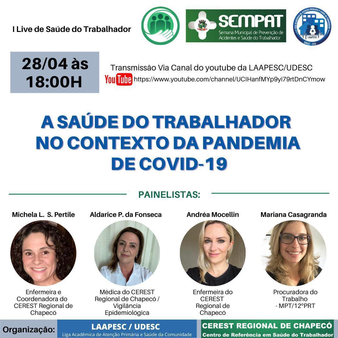 A coordenação do Centro de Referência em Saúde do Trabalhador da região de Chapecó e a Liga Acadêmica de Atenção Primária e Saúde da Comunidade/Udesc, promovem nesta quarta-feira, às 18h, a I Live de Saúde do Trabalhador A Saúde do Trabalhador no Contexto da Pandemia da Covid-19.