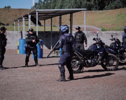 Instruções de abordagem e tiro com pistola 380 e espingarda calibre 12 foram realizadas nesta sexta-feira, com o pelotão de motos da Guarda Municipal de Chapecó, no encerramento de um treinamento que durou uma semana. Desde segunda-feira eles realizaram também testes físicos, treinamento de defesa pessoal, direção defensiva, direção em diferentes terrenos e condução de moto em área urbana.