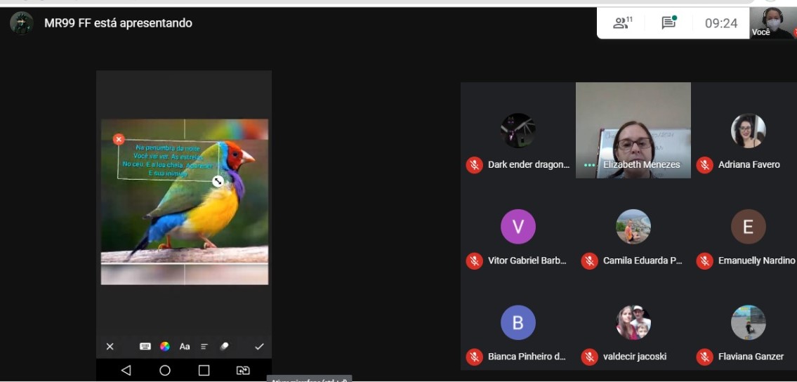 A atividade foi uma sugestão das professoras Elizabeth Menezes e Margaret Schmidt Elizabeth disse que no início foi uma forma de instigá-los à leitura e participação efetiva das aulas remotas.