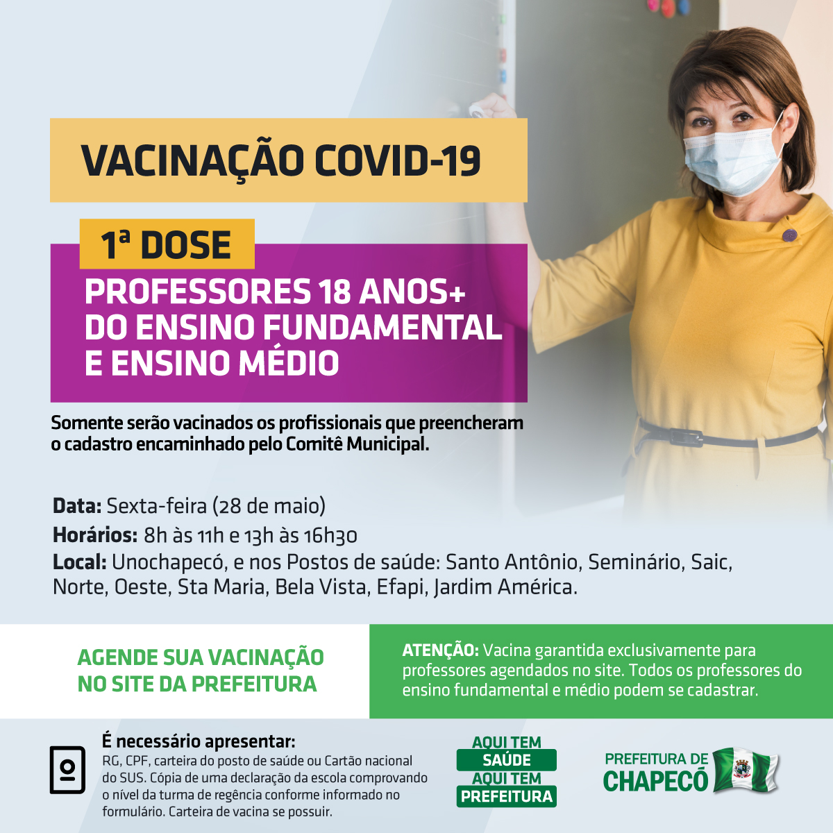 No sábado serão vacinados todos os profissionais da educação do nível superior, nos seguintes locais: Unochapecó, CEV e Udesc. O agendamento também é no site da Prefeitura. Os horários são das 8h às 11h e, das 13h às 16h.