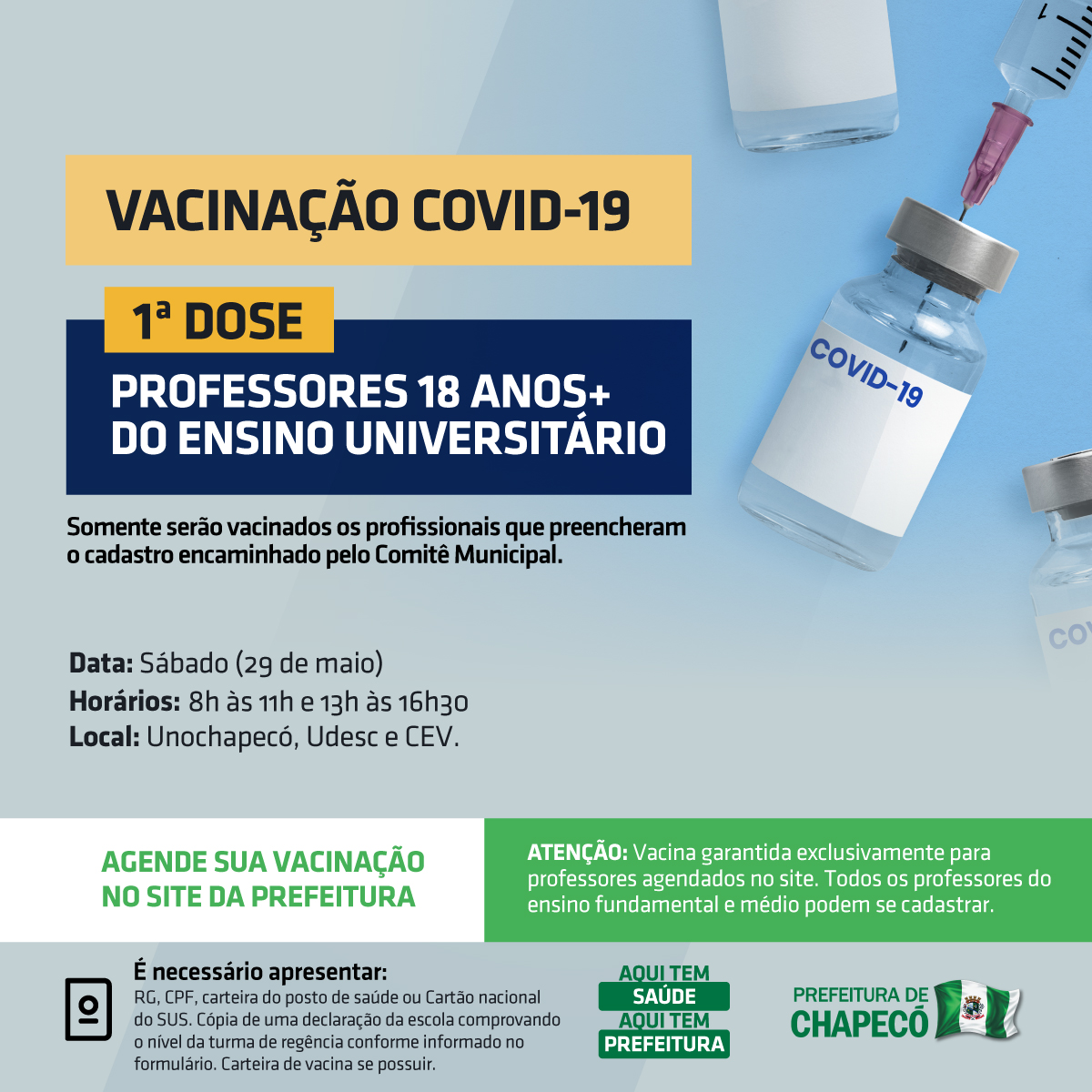 A vacinação será sábado, dia 29 de maio. Os horários são das 8h às 11h e, das 13h às 16h, nos seguintes locais: Unochapecó, CEV e Udesc.