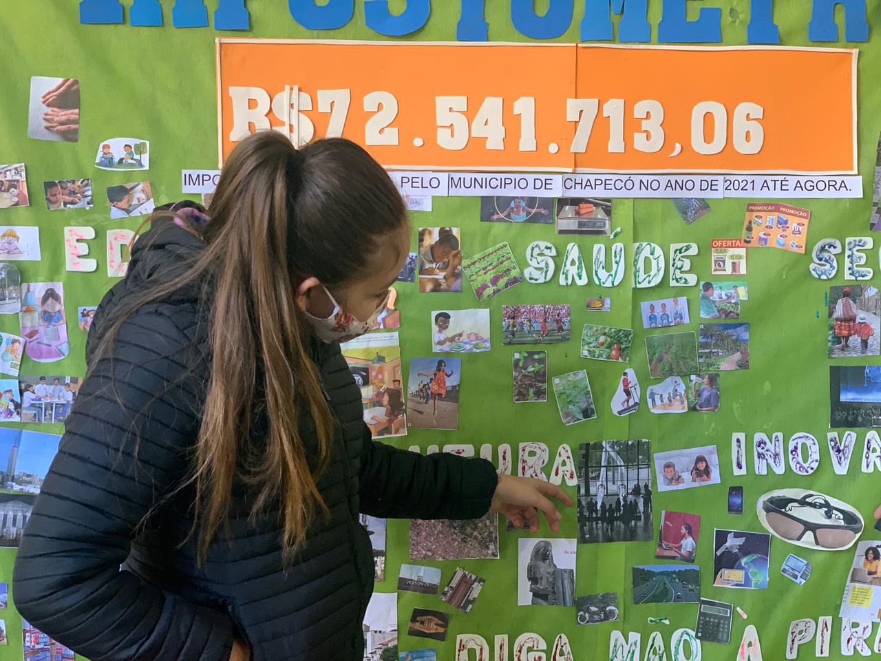 Na instituição, estudantes e professores elaboraram um painel do impostômetro, que mostra a arrecadação de Chapecó até esta data, e outro com experiências das famílias e dos adolescentes descrevendo o que pode ser melhorado dentro de casa para diminuir as despesas, valorizar produtos não piratas e contribuir da mesma forma com a meio ambiente, reduzindo o consumo de água, luz e a produção de lixo.