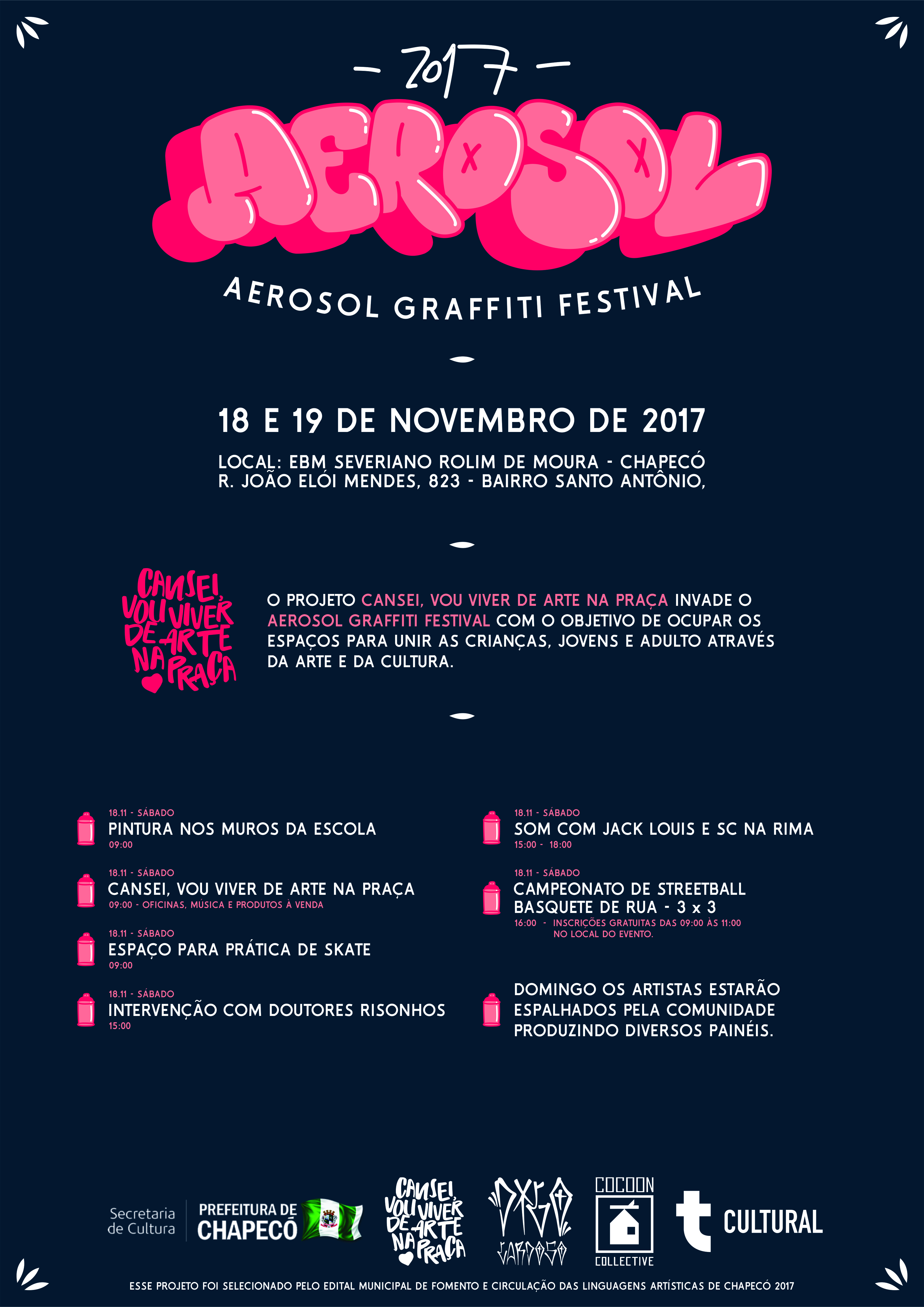A comunidade do Bairro Santo Antonio irá receber no próximo final de semana, dias 18 e 19 de novembro, o Aerosol Grafitti Festival Chapecó. A ação tem como objetivo ocupar o espaço público e levar a arte, em diferentes linguagens e modalidades, de maneira gratuita, democrática e de fácil acesso aos chapecoenses.