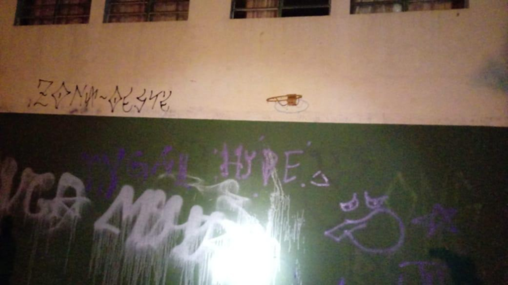 Na noite desta sexta-feira (28), por volta das 21h15min, a Central de Operações da Guarda Municipal recebeu a denúncia de masculinos realizando pichação na Praça André Marafon no bairro São Cristóvão. De imediato uma guarnição que estava nas proximidades do local, deslocou até a praça e localizou quatro pessoas, sendo três masculinos e uma feminina, e logo procedeu com a abordagem. Em busca na mochila de um dos abordados foi localizado um frasco de spray na cor roxa, praticamente vazio, mesma cor das pichações realizadas na parede da praça. Indagados, os abordados, todos menores, com idades entre 16 e 17 anos, ambos confessaram a participação no fato, sendo que o próprio material localizado já comprovava.