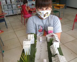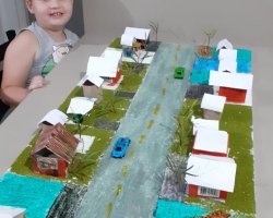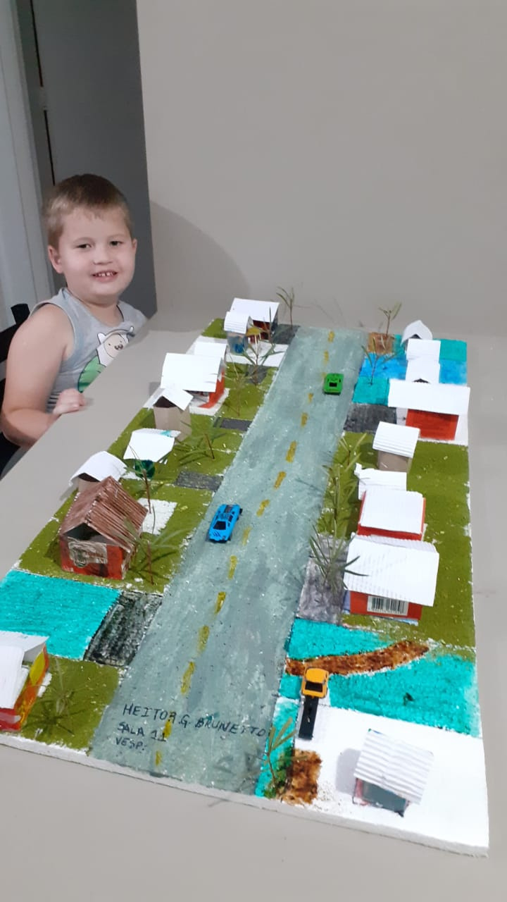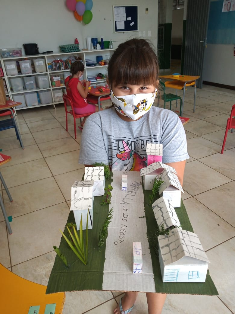 Para a conclusão do projeto a professora propôs aos alunos, tanto do Ensino com abordagem Híbrida como os do Remoto, a construção de uma maquete com materiais recicláveis. O resultado da proposta foi uma linda exposição no CEIM de miniaturas maravilhosas produzidas pelas crianças com o apoio de suas famílias.
