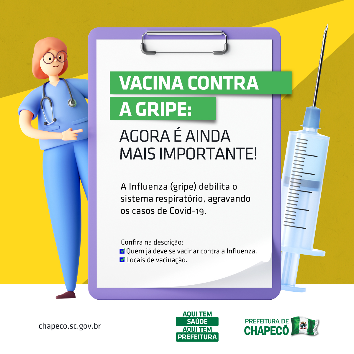 A Vigilância Epidemiológica de Chapecó informa que a partir desta quarta-feira está disponível a vacina contra a Gripe para o grupo de pessoas com comorbidades. Basta apresentar um comprovante, como receita ou atestado médico. Também continua aberta a imunização para crianças de seis meses a menores de seis anos, gestantes, puérperas, profissionais de saúde, idosos, professores e indígenas.