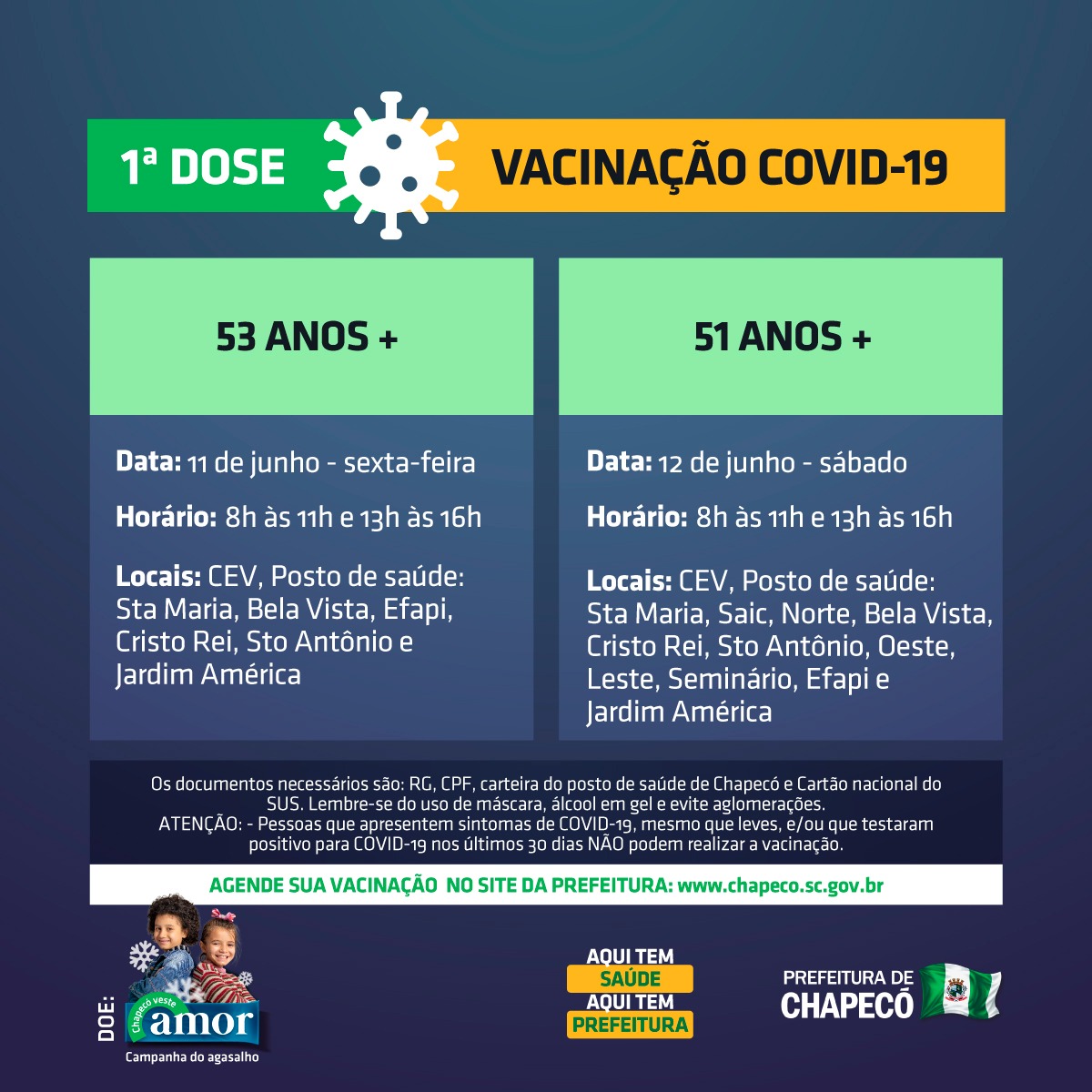 A Administração Municipal de Chapecó está abrindo vacinação contra a Covid para 53 e 54 anos, na sexta-feira, e 52 e 51 anos, no sábado. O agendamento será site da prefeitura (www.chapeco.sc.gov.br). Os horários são das 8h às 11h e, das 13h às 16h.