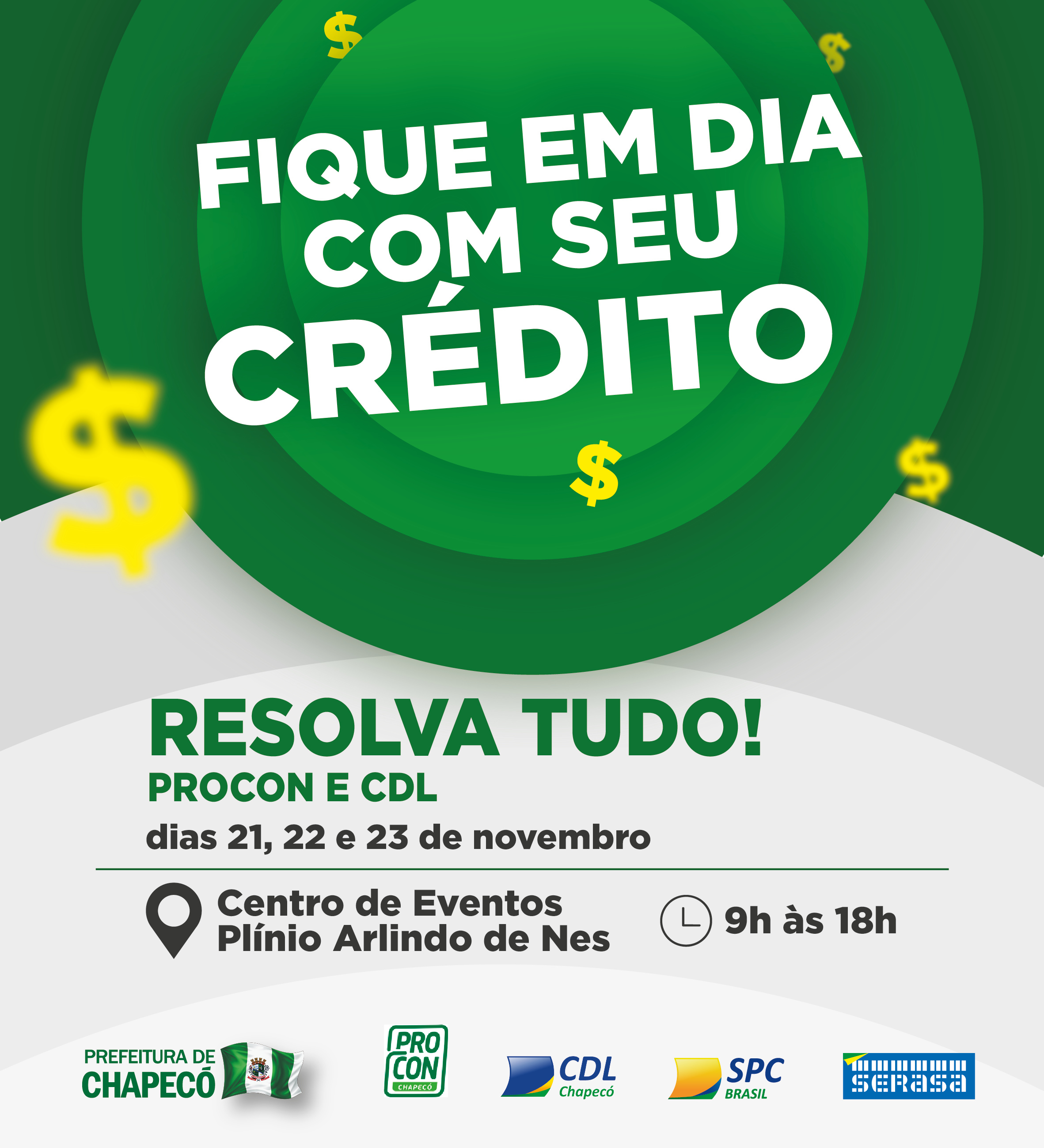 Com o objetivo de auxiliar pessoas que se encontram em situação de inadimplência no comércio chapecoense a regularizar sua situação, a Câmara de Dirigentes Lojistas de Chapecó (CDL), em parceria com o PROCON e a Prefeitura, inicia nesta terça-feira (21) o RESOLVA TUDO. A iniciativa prossegue na quarta e quinta-feira das 8h às 18h no Centro de Cultura e Eventos Plínio Arlindo de Nes.