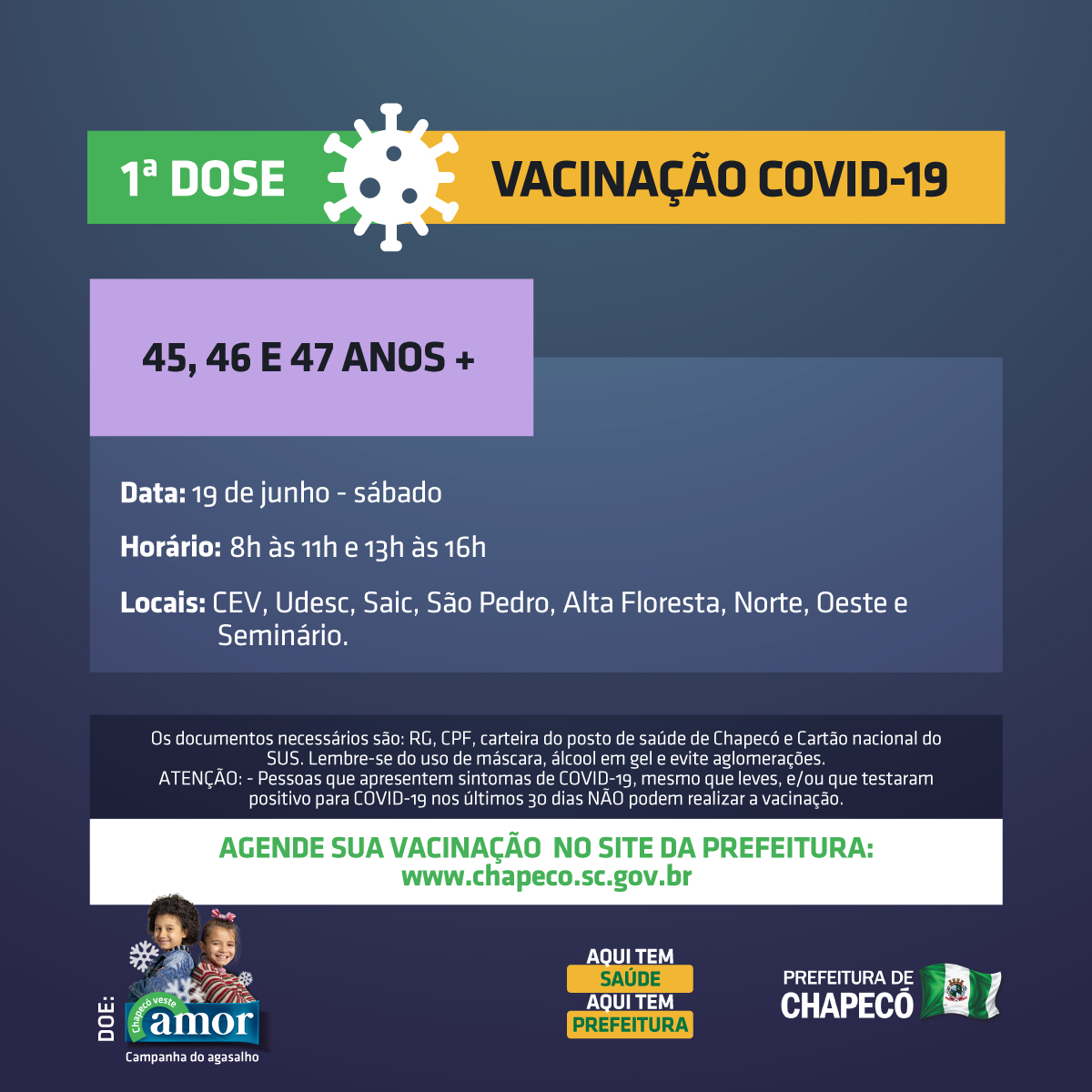 A Secretaria de Saúde de Chapecó abriu agendamento para vacinação contra a Covid para quem tem 45 anos completos ou mais, que será neste sábado. O cadastramento de horário e local deve ser feito no site da Prefeitura (www.chapeco.sc.gov.br).