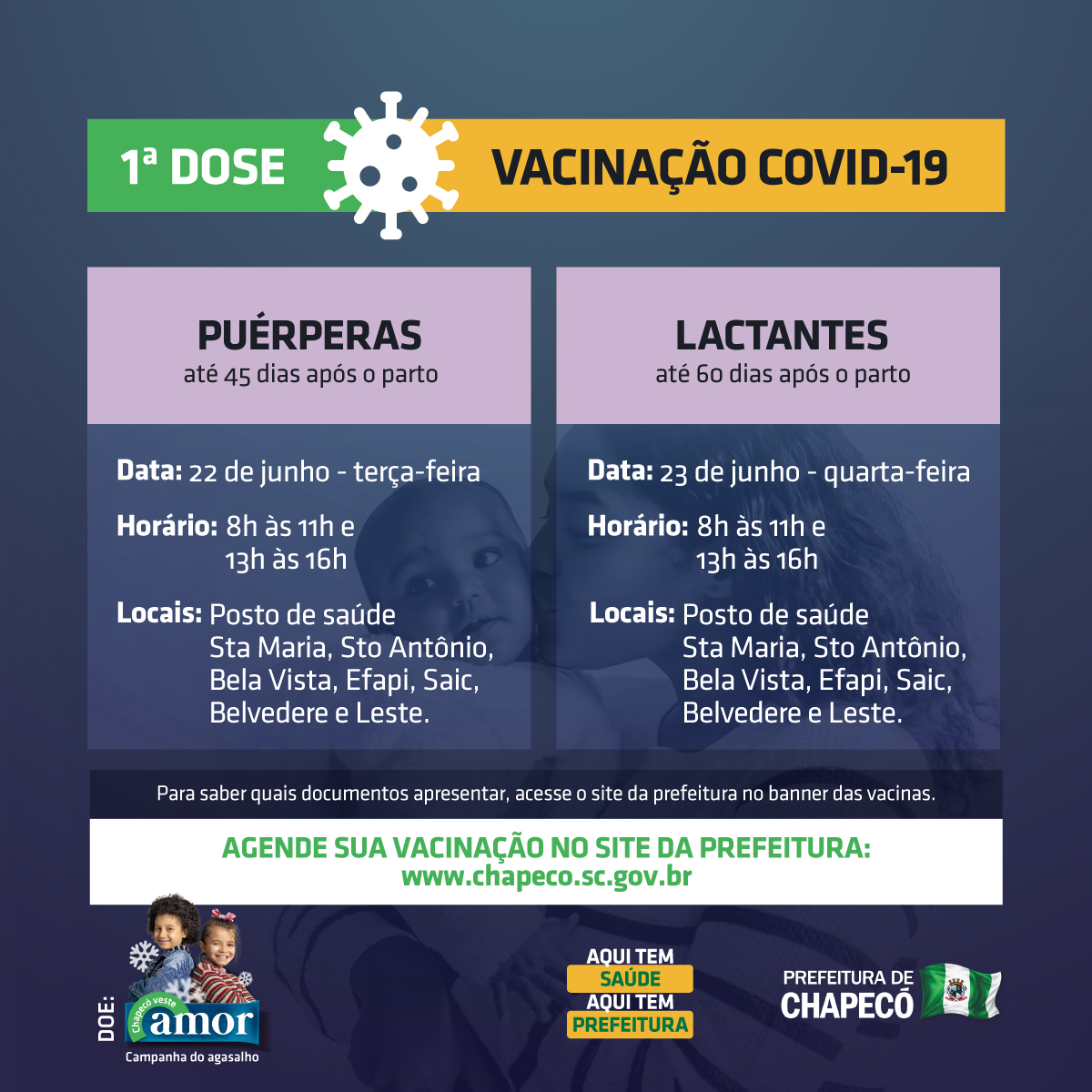 A Secretaria de Saúde de Chapecó informa que, para tomar a vacina contra a Covid-19, as gestantes, puérperas e lactantes devem comprovar a sua condição pelos seguintes documentos, conforme o caso: carteira de acompanhamento pré-natal, declaração de nascimento da criança, relatório médico ou prescrição indicando a vacina Covid-19, conforme orientação da Diretoria de Vigilância Epidemiológica (DIVE) do Estado. Segundo a DIVE as mulheres que estão amamentando não devem fazer a vacinação sem a orientação médica.