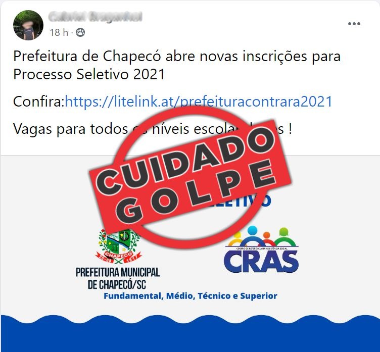 A Administração Municipal de Chapecó informa que não procede informação em rede social sobre concurso para os Centros de Referência em Assistência Social (CRAS), que está publicado em rede social. A secretaria de Assistência Social reitera que há uma lei federal (PL 173/20), que restringe a contratação de servidores públicos.