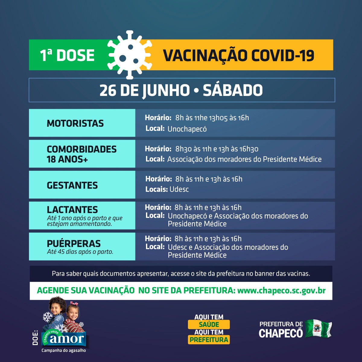 Lembrando que todos devem levar documentos como RG, CPF, cartão do SUS ou do Posto e Saúde e comprovante que ateste sua condição (atestado médico), de acordo com cada grupo.