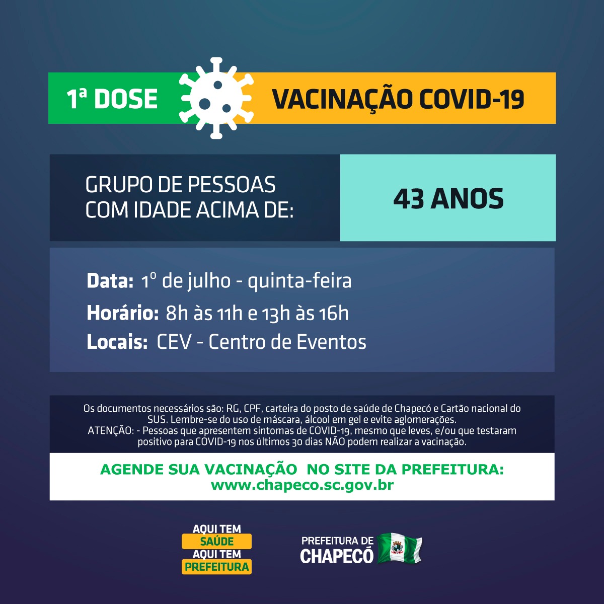 Chapecó reabriu a faixa etária de vacinação contra a Covid ,da população em geral, para 43 anos, nesta quinta-feira. Os horários são das 8h às 11h e das 13h às 16h, no Centro Estratégico de Vacinação, no Centro de Eventos. O agendamento no site da Prefeitura, no www.chapeco.sc.gov.br, esgotou no início da tarde desta quarta-feira, pois atingiu limite de doses.