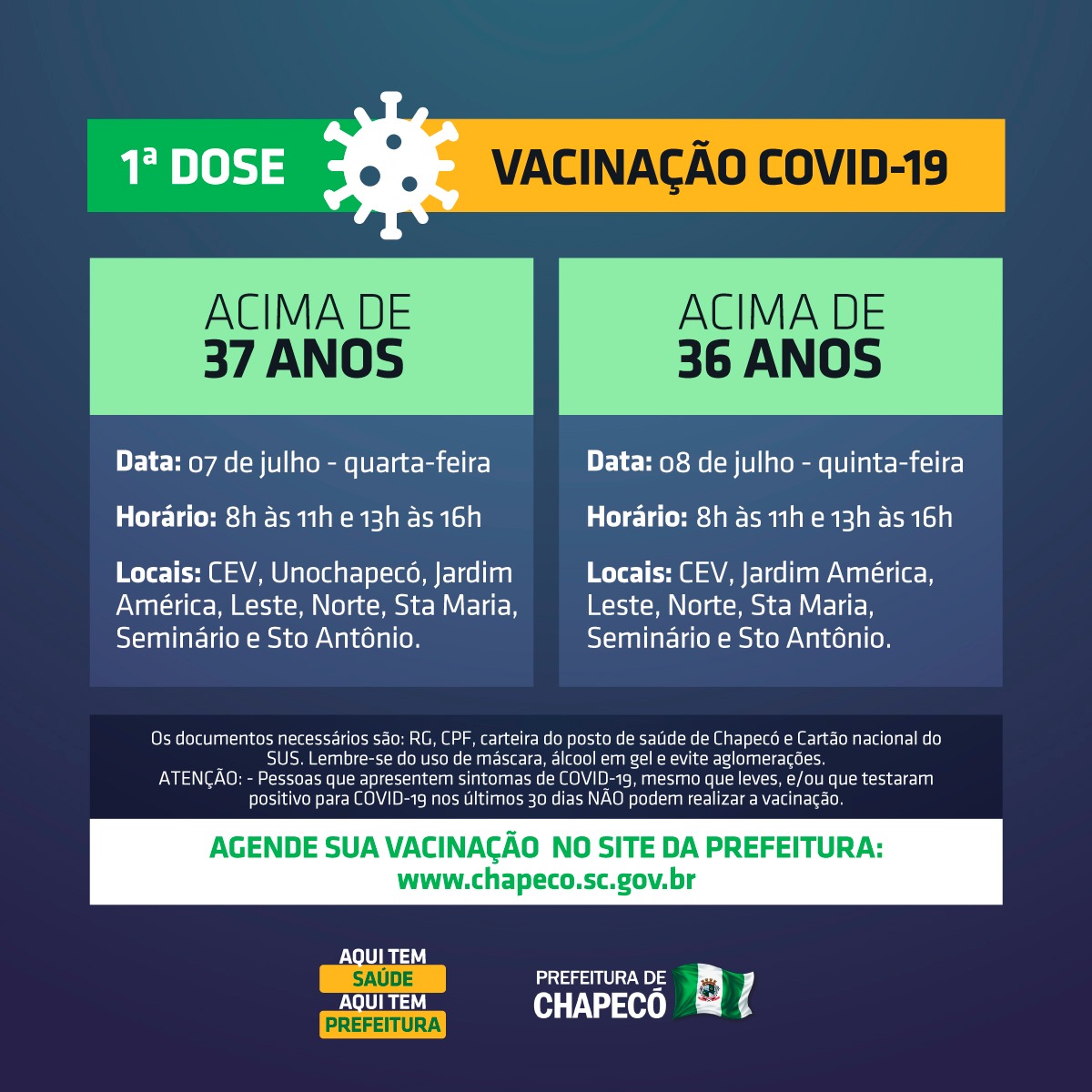 A Secretaria de Saúde de Chapecó abriu mais um agendamento de vacinação contra a Covid, de 37 anos, na quarta-feira, e 36 anos, na quinta-feira. Para isso é necessário o agendamento no site da Prefeitura (www.chapeco.sc.gov.br).