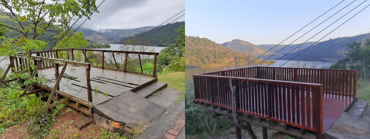 O Mirante do Lago, no Goio-Ên, acaba de ser revitalizado pela Administração Municipal de Chapecó. No início do ano o local estava com várias tábuas quebradas e representava um risco para a segurança dos visitantes. Por isso a Diretoria de Desenvolvimento Econômico contratou uma empresa para a reforma de todo o assoalho, reforço das laterais e parapeitos, com madeira tratada de pinus, além da pintura.