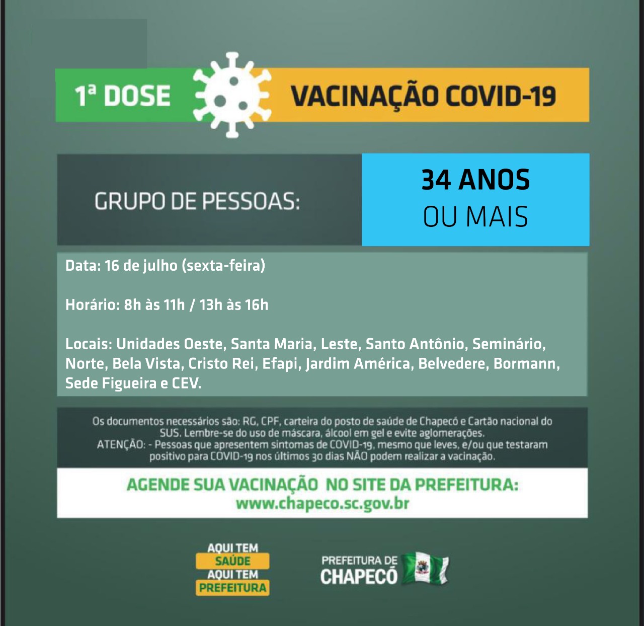 Um novo agendamento para vacinação de 34 anos ou mais, contra a Covid, está disponível no site da Prefeitura (www.chapeco.sc.gov.br). A aplicação será na sexta-feira (16/07), das 8h às 11h e das 13h às 16h, nos seguintes postos de saúde: Oeste, Santa Maria, Leste, Santo Antônio, Seminário, Norte, Bela Vista, Cristo Rei, Efapi, Jardim América, Belvedere, Bormann, Sede Figueira e CEV.