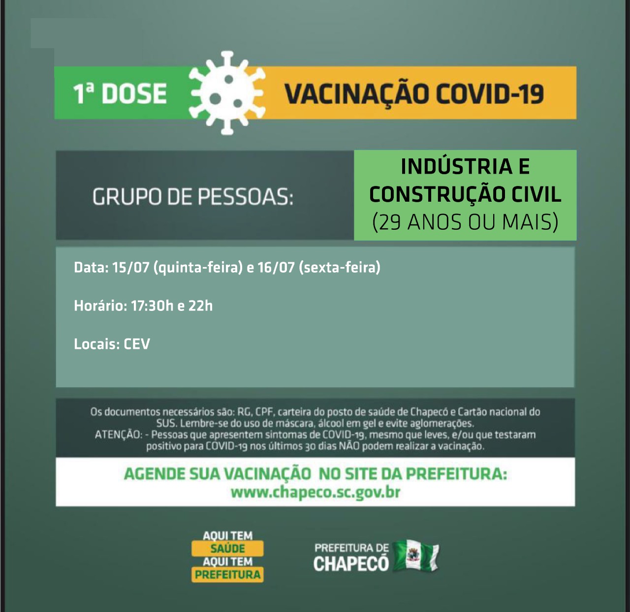 Com a chegada de novas doses de vacina contra a Covid a Secretaria de Saúde de Chapecó vai realizar um Corujão de Vacinação para trabalhadores da Indústria e Construção civil, com mais de 29 anos, nesta quinta e sexta-feira. O horário será das 17h30 às 22h, no Centro Estratégico de Vacinação (CEV), que fica no Centro de Cultura e Eventos.