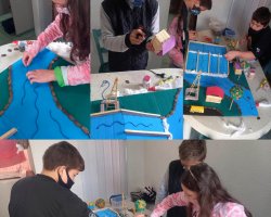 As maquetes foram produzidas pelos alunos e familiares com materiais recicláveis e também com material fornecido pela escola.