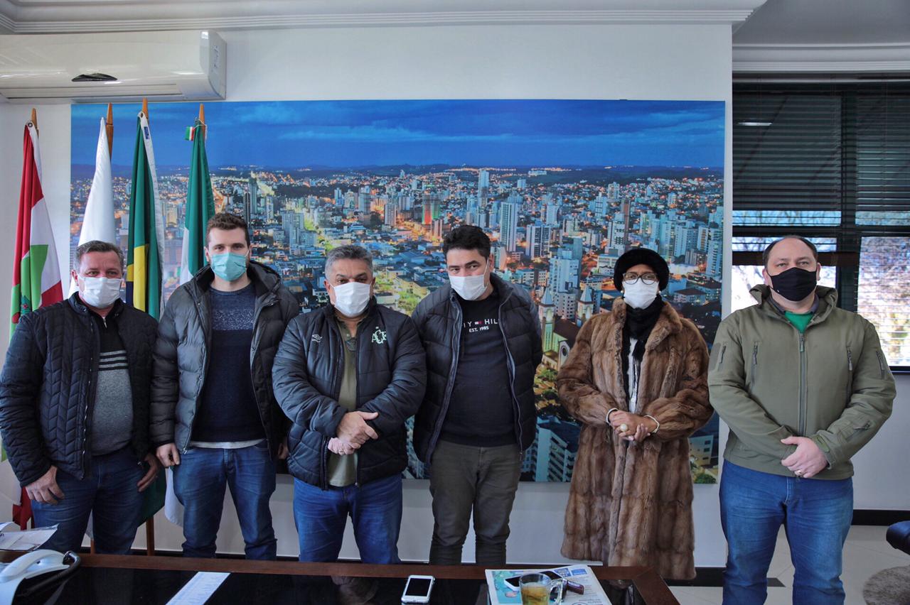 Uma comitiva de vereadores de Pato Branco-PR esteve no gabinete do prefeito de Chapecó, João Rodrigues, nesta segunda-feira. Eles vieram conhecer as ações da gestão municipal, principalmente na área da Saúde. Estiveram presentes os vereadores Romulo Faggion (PSL), Claudemir Zanco - Biruba (PL), Maria Cristina Hamera (PV) e Eduardo Dala Costa (MDB). O secretário de Infraestrutura de Chapecó, Luiz Paulo Carraro, acompanhou a vista.