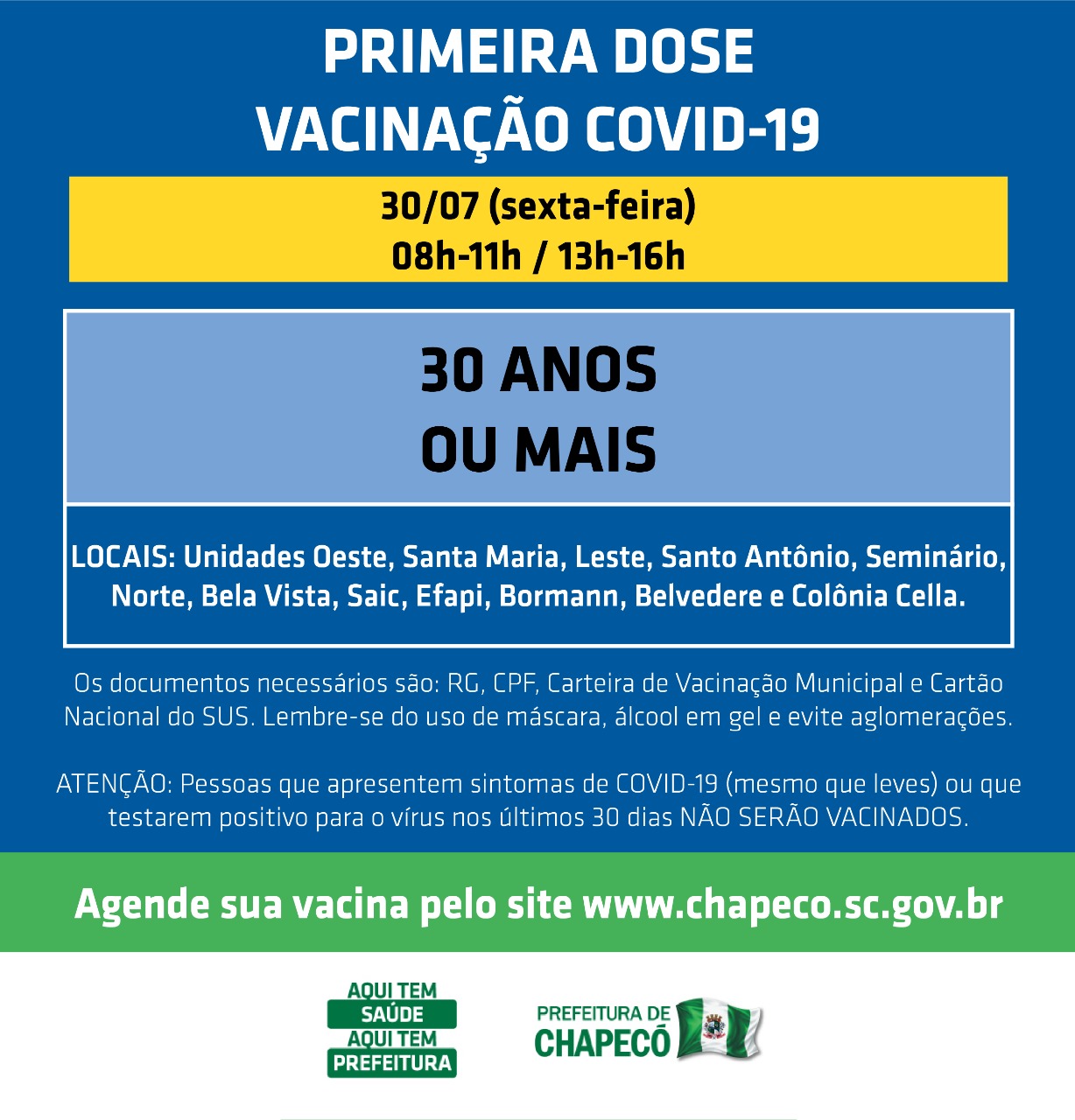 A Secretaria de Saúde de Chapecó anunciou que vai vacinar 30 anos ou mais nesta sexta-feira. O agendamento está disponível no site da prefeitura (www.chapeco.sc.gov.br).