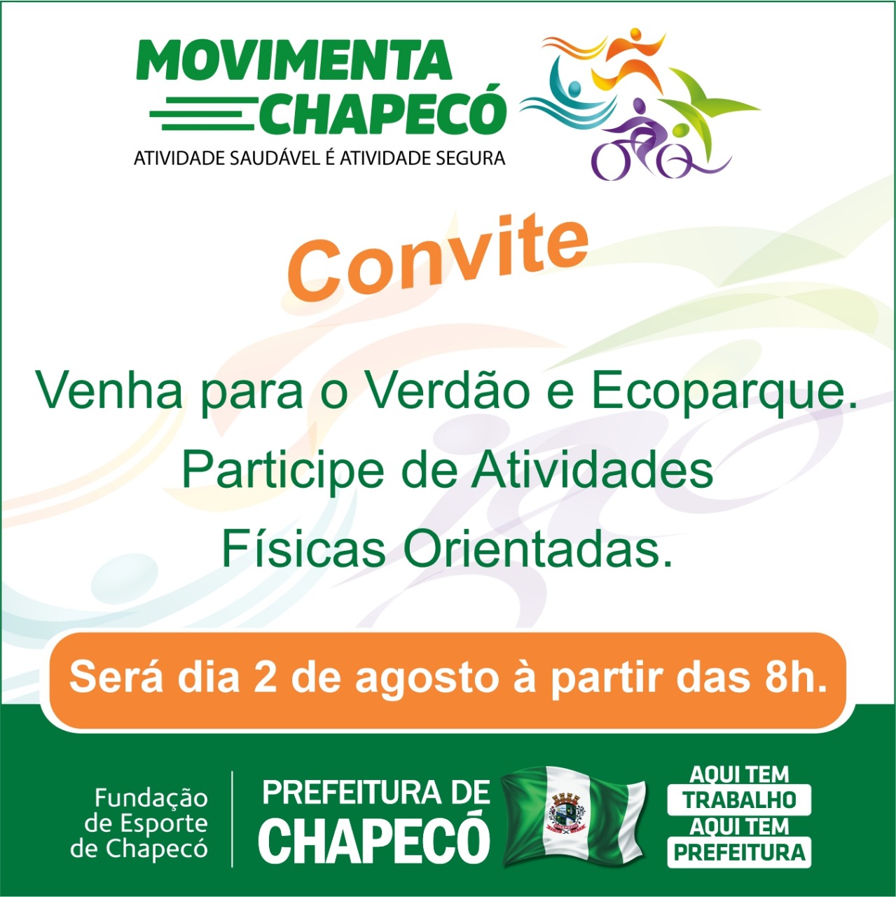 O projeto Movimenta Chapecó Pós-Covid será lançado na segunda-feira às 8h, no Complexo Esportivo Verdão, dando início às comemorações de aniversário do município, que completa 104 anos de emancipação, neste mês de agosto.