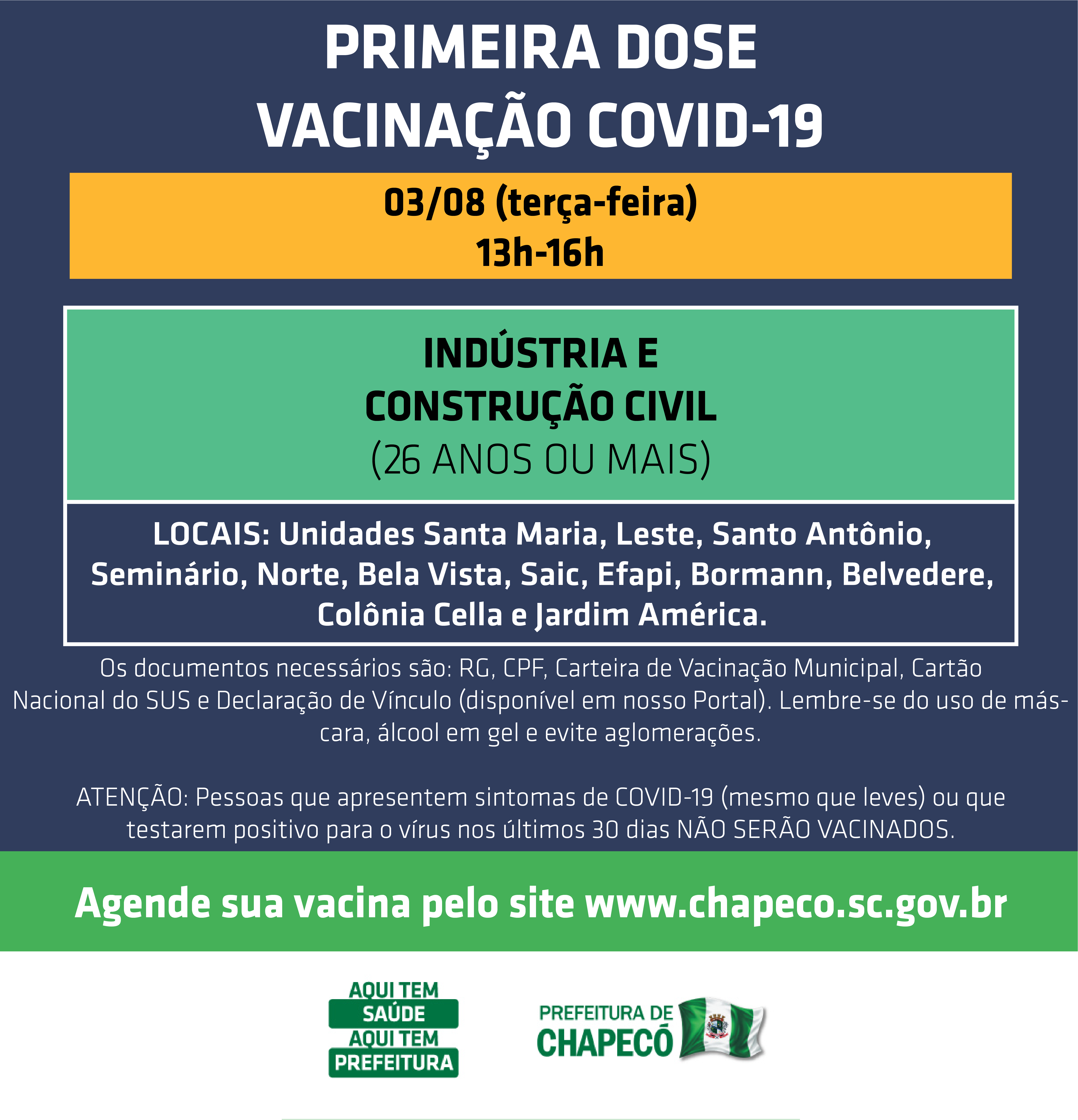 Inicia nesta tarde de sábado um novo agendamento para a primeira dose da vacina contra o Covid-19, desta vez direcionado a funcionários da indústria e construção civil que tenham 26 anos ou mais, para dia 03/08 (terça-feira). Os locais de vacinação serão: Unidades Santa Maria, Leste, Santo Antônio, Seminário, Norte, Bela Vista, Saic,Efapi, Bormann, Belvedere, Colônia Cella e Jardim América.