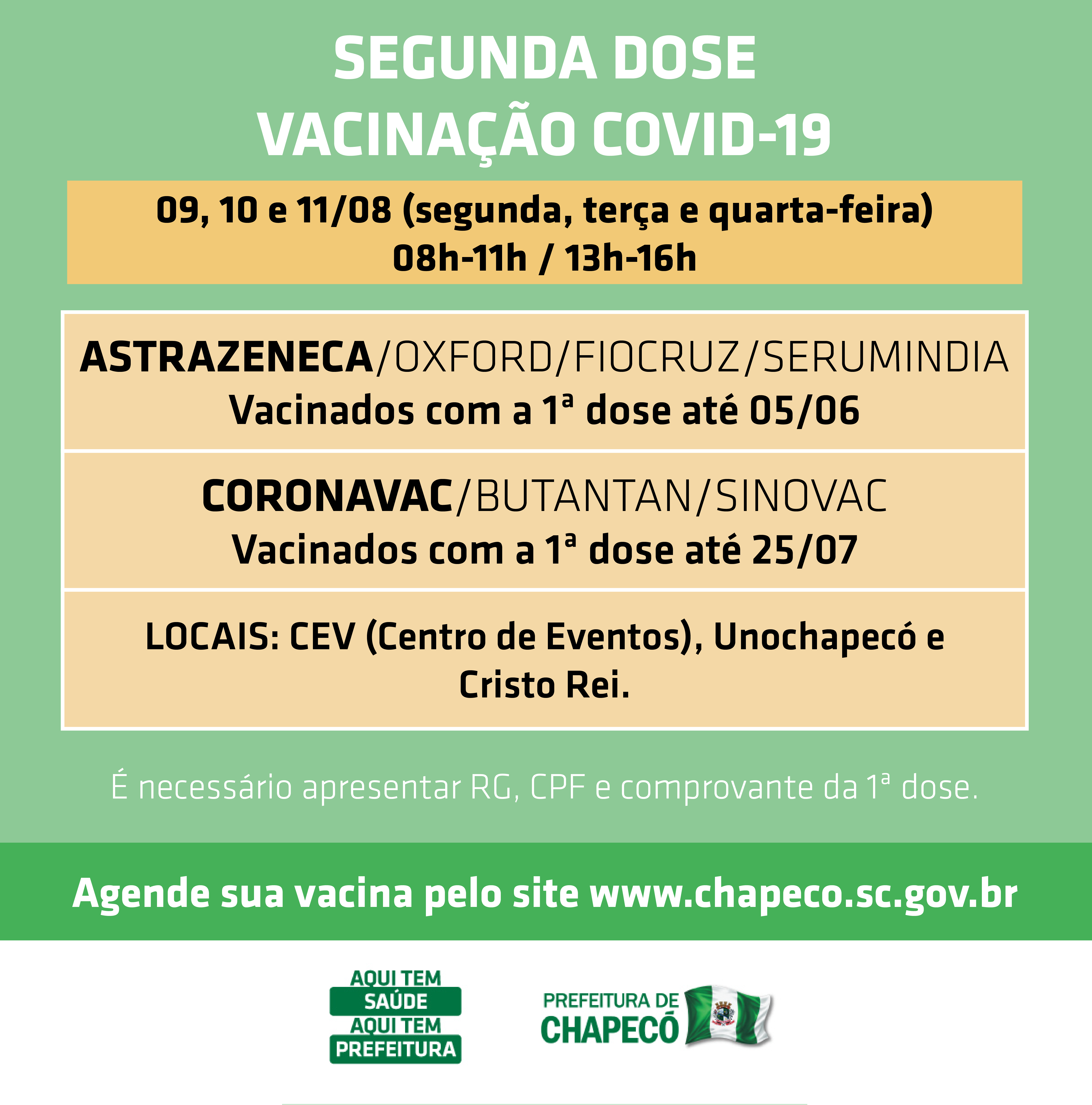 O agendamento é no site da Prefeitura (www.chapeco.sc.gov.br). Os horários são das 8h às 11h e das 13h às 16h, no Centro Estratégico de Vacinação (CEV) e Unochapecó.