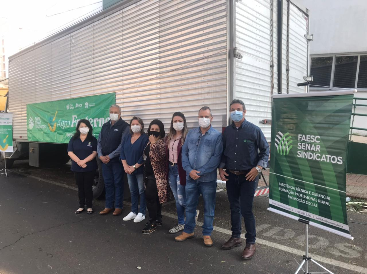 O Agro Fraterno programa nacional que visa arrecadar alimentos para doação às famílias do meio rural afetadas pela pandemia entregou na manhã desta segunda-feira (9) 353 cestas básicas, de 18 kg cada, ao Poder Público Municipal de Chapecó. Em Santa Catarina, a iniciativa é do Serviço Nacional de Aprendizagem Rural (SENAR/SC), órgão vinculado à Federação da Agricultura e Pecuária do Estado de Santa Catarina (FAESC), em parceria com as entidades e organizações que fazem parte do Fórum Permanente do Agro Catarinense.