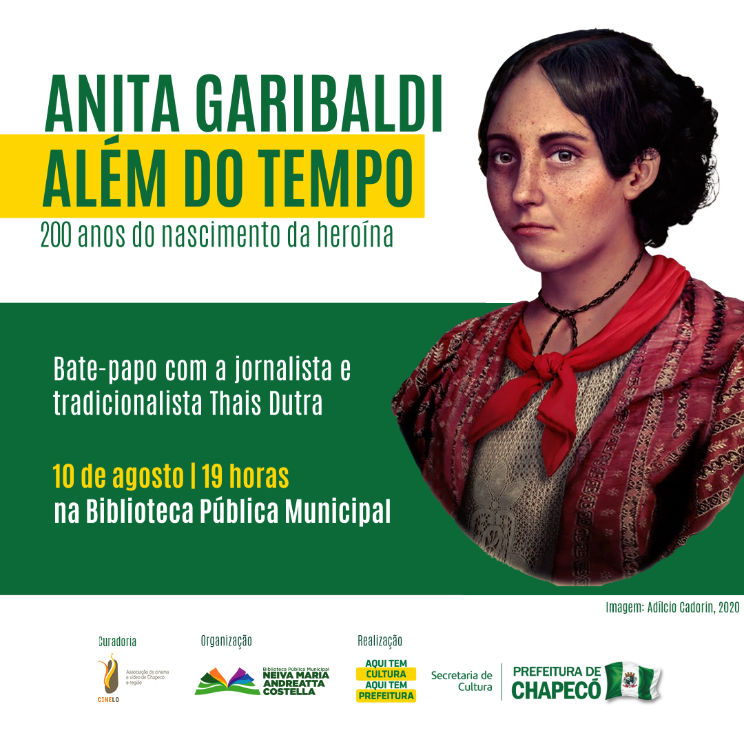 A Biblioteca Pública Municipal Neiva Maria Andreatta Costella promove, nesta terça-feira (10), às 19h, o bate-papo Anita Garibaldi além do tempo: 200 anos do nascimento da heroína. O evento tem o objetivo de valorizar a história de Anita e comemorar o seu bicentenário, que se completa neste mês de agosto. A conversa contará com a presença de Thais Dutra, jornalista, tradicionalista e autora de um livro sobre a heroína de dois mundos.
