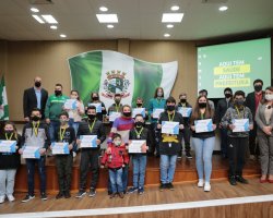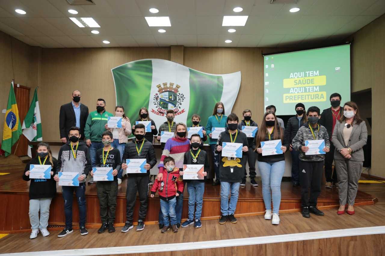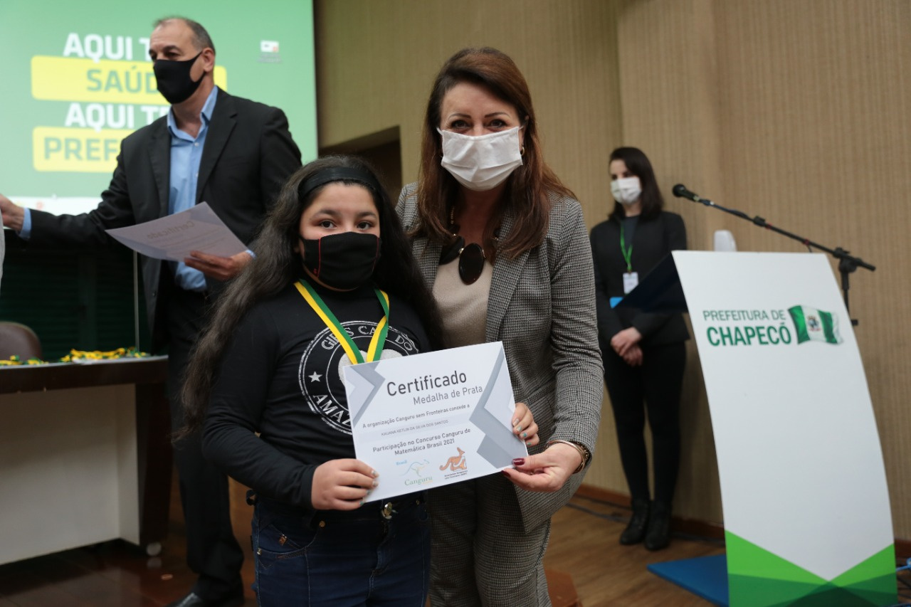 A Secretaria de Educação de Chapecó realizou na manhã desta quinta-feira, no auditório da Prefeitura, a entrega de medalhas e certificados para 57 alunos de oito escolas, por premiações no Concurso Canguru de Matemática, Olimpíada Brasileira de Astronomia e Astronáutica (OBA) e Concurso Maria da Penha.
