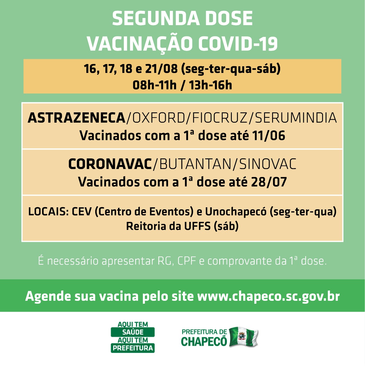 O agendamento é no site da Prefeitura (www.chapeco.sc.gov.br). No local de vacinação é necessário apresentar o RG, CPF e comprovante de primeira dose.