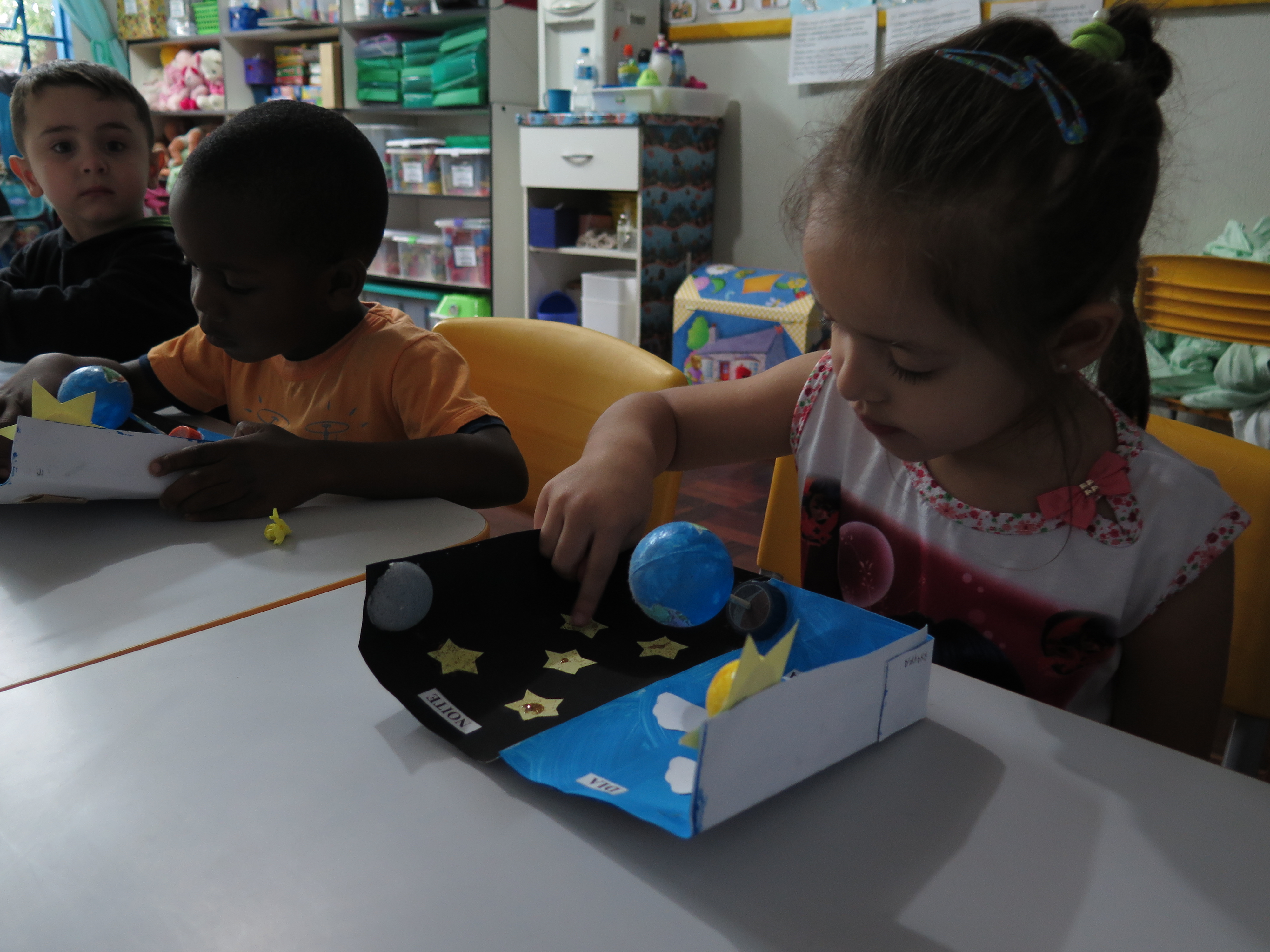 Para deixar o projeto lúdico e despertar ainda mais o interesse das crianças, foram pendurados planetas e estrelas pelo teto, organizado um espaço na sala de aula com luzes especiais, painéis, histórias infantis, e ainda um foguete com material reciclável. Além disso, demonstraram os movimentos de rotação e translação do planeta terra, construíram uma via láctea entendendo a posição que cada um ocupa e um foguete com caixa de papelão do tamanho dos alunos, para que pudessem interagir e brincar de faz de conta.