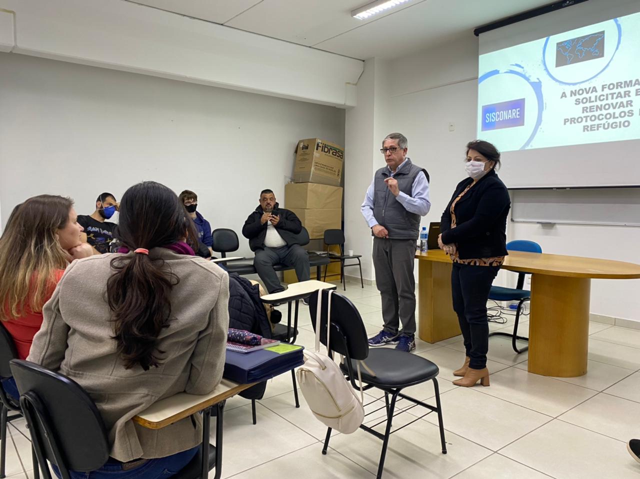 A capacitação foi ministrada pelo agente administrativo da Polícia Federal, Alcione Vergil, direcionada ao Centro de Atendimento ao Imigrante - CAI, aos Centros de Referência de Assistência Social - CRAS e aos Centros de Referência Especializado em Assistência Social CREAS.