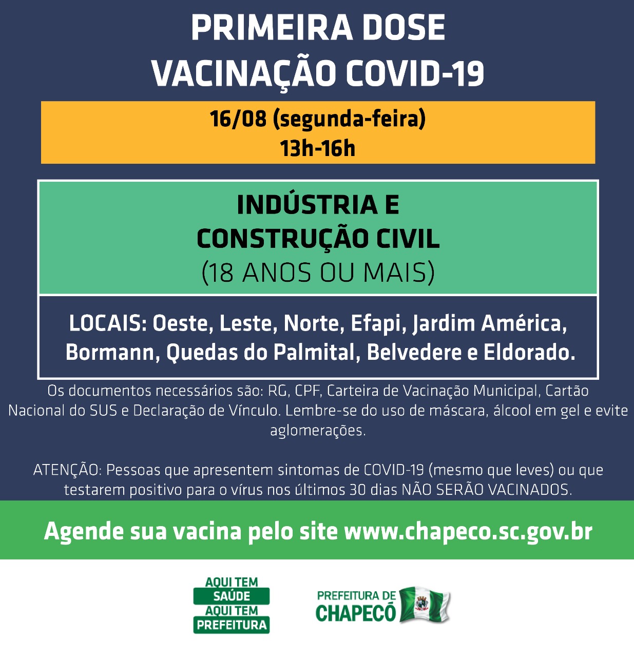 Trabalhadores da Indústria e Construção Civil acima de 18 anos poderão vacinar contra a Covid, em Chapecó, na segunda-feira à tarde, das 13h às 16h. Os locais de vacinação serão as unidades Oeste, Leste, Norte, Efapi, Jardim América, Marechal Bormann, Quedas do Palmital, Belvedere, Eldorado, Sul e Jardim América.