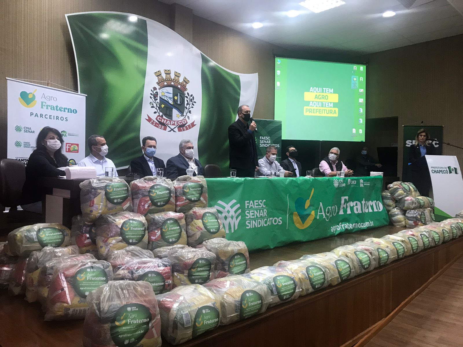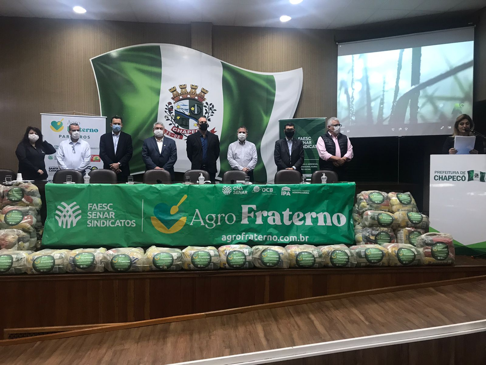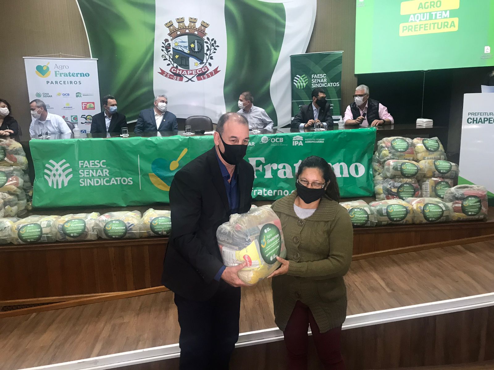 A ação faz parte de uma doação de 706 cestas básicas do programa Agro Fraterno, que foram repassadas pela Federação da Agricultura e Pecuária do Estado de Santa Catarina (Faesc), Serviço Nacional de Aprendizagem Rural (Senar) e entidades e organizações que fazem parte do Fórum Permanente do Agro Catarinense.