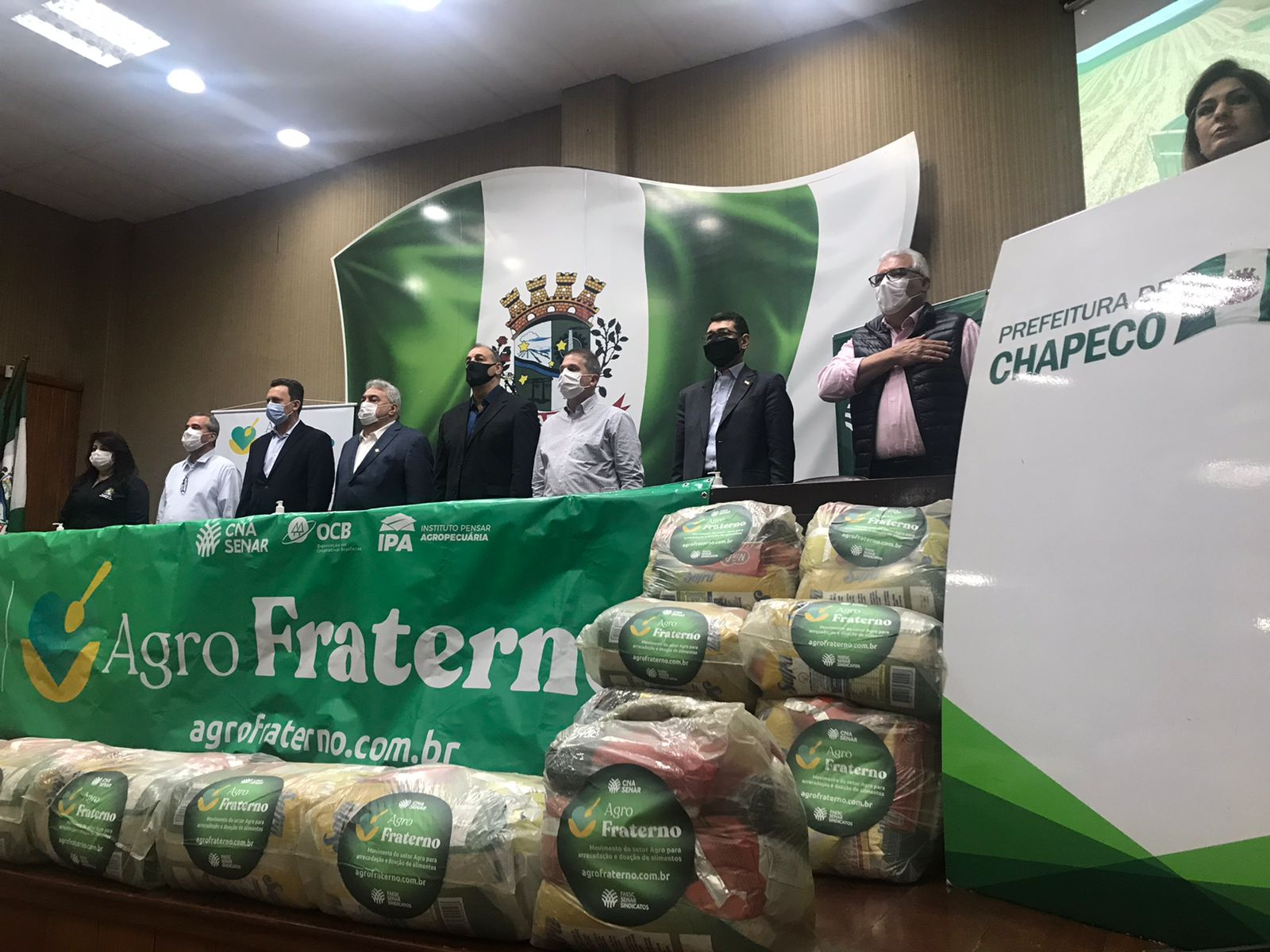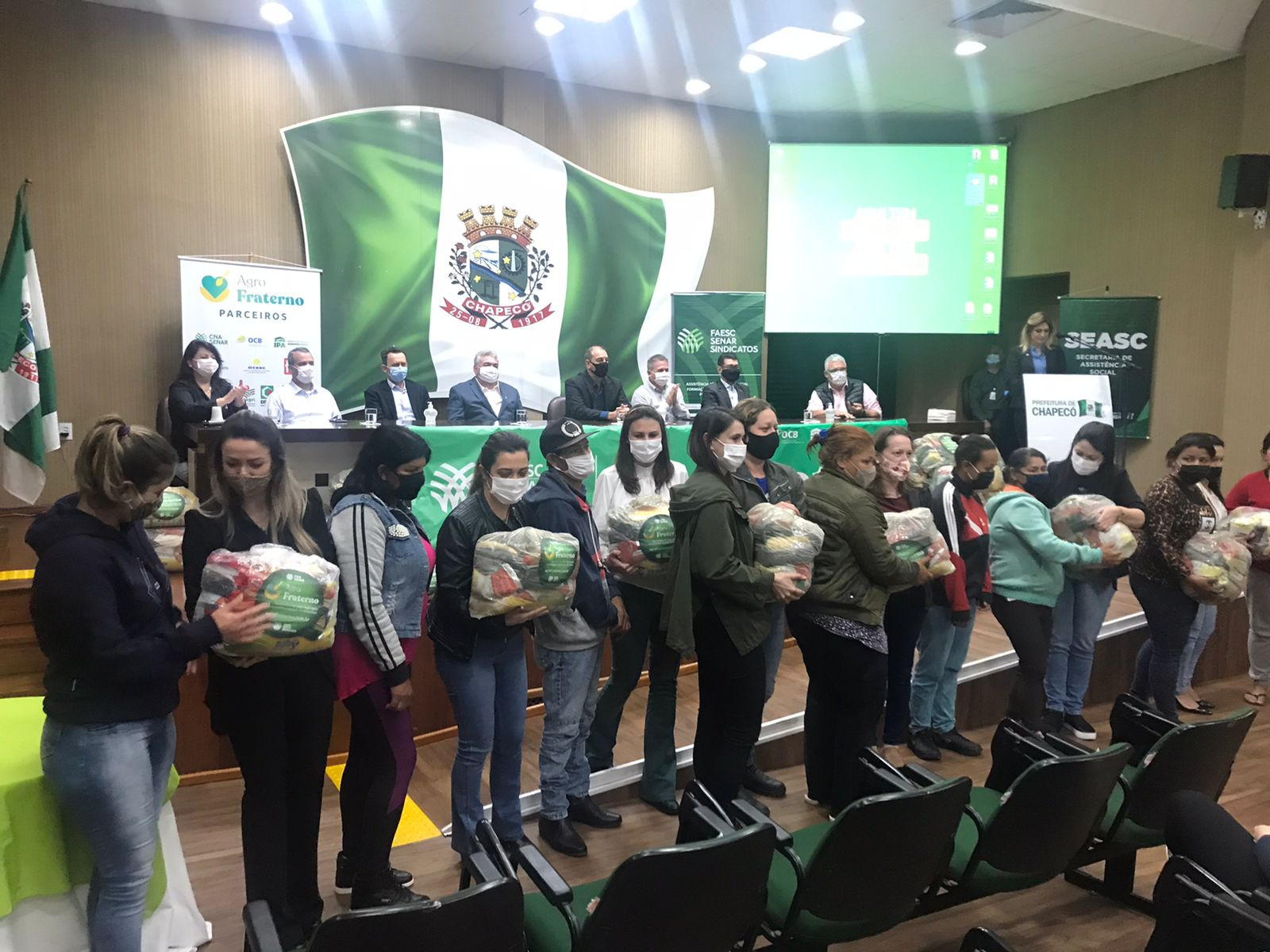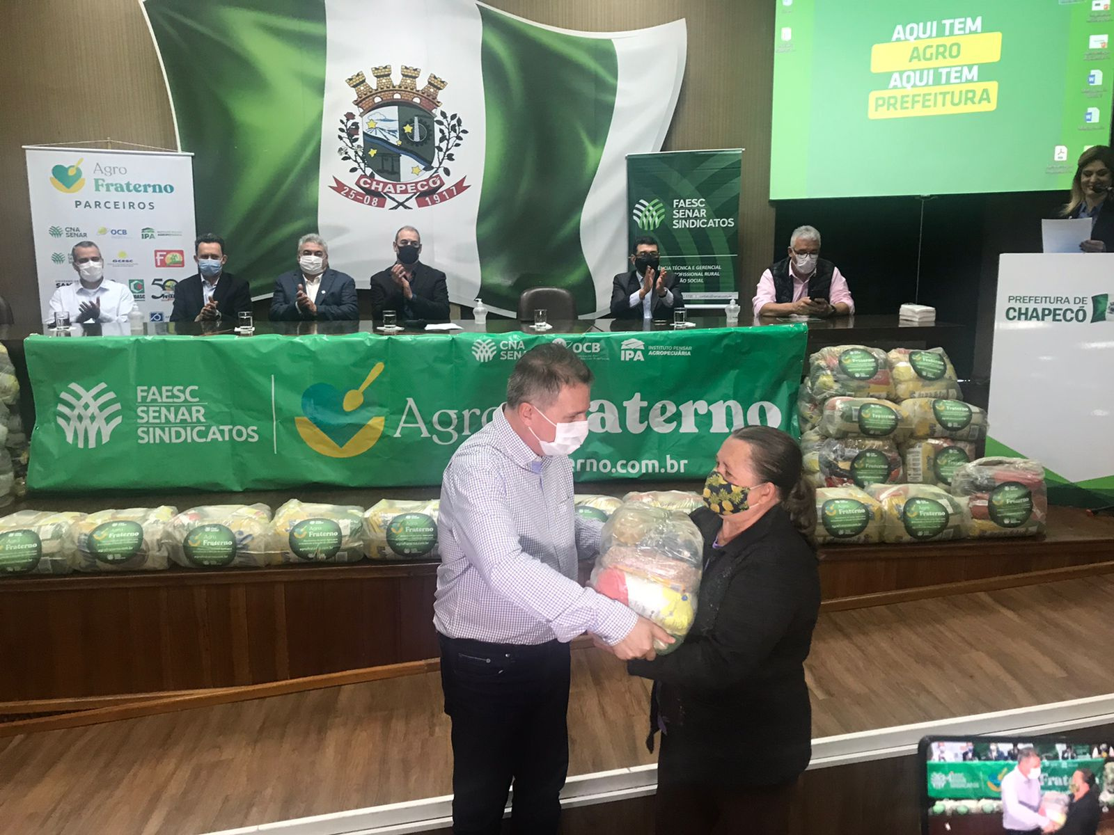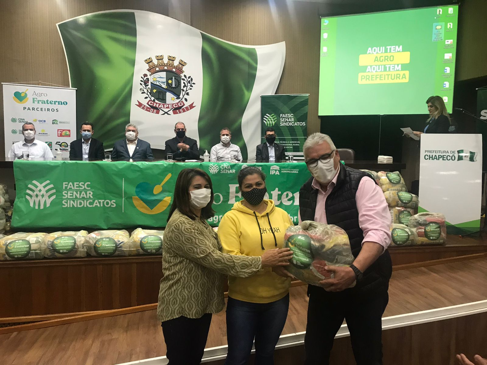 A ação faz parte de uma doação de 706 cestas básicas do programa Agro Fraterno, que foram repassadas pela Federação da Agricultura e Pecuária do Estado de Santa Catarina (Faesc), Serviço Nacional de Aprendizagem Rural (Senar) e entidades e organizações que fazem parte do Fórum Permanente do Agro Catarinense.
