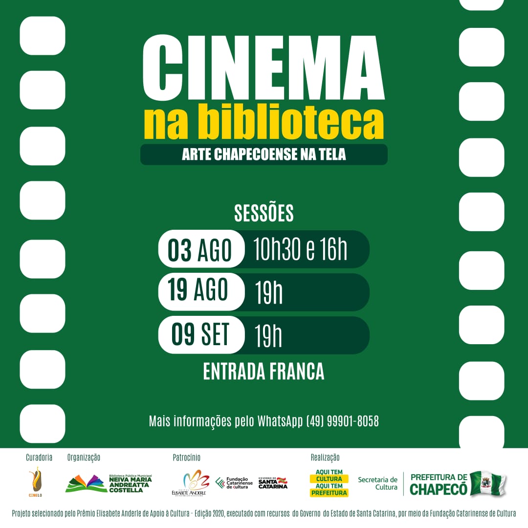 A Biblioteca Pública Municipal Neiva Maria Andreatta Costella promoverá sessões de cinema com filmes chapecoenses. Serão exibidas duas produções: O Poeta de Cordel e No Quintal de Rosalina, nos dias 19 de agosto e 9 de setembro, respectivamente. Ambas as sessões serão gratuitas, às 19h, na sede da Biblioteca. As vagas serão limitadas, para participar será necessário reservar lugar através do WhatsApp (49) 999 018 058.
