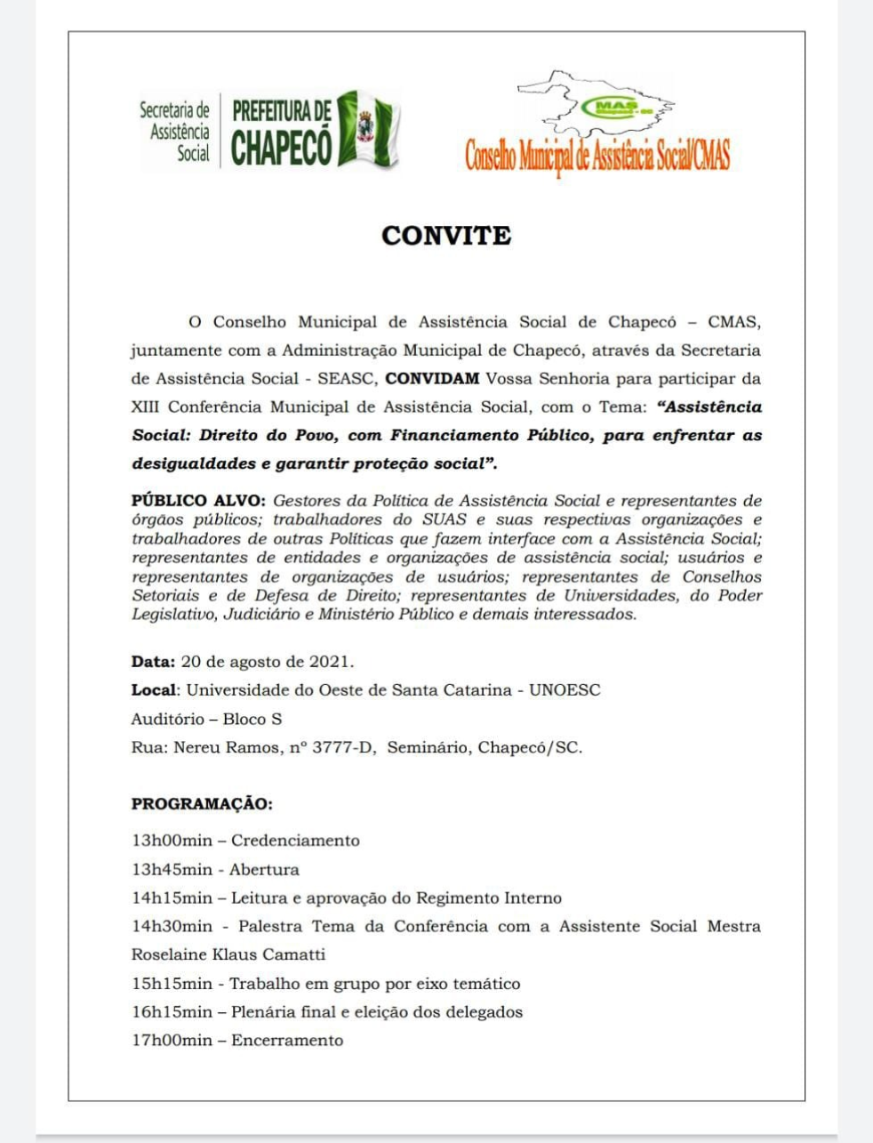 A Secretária de Assistência Social, Sra. Elisiani Sanches e a Presidente do Conselho Municipal de Assistência Social, Sra. Daiane Magali Chaves, informam que nesta sexta-feira será realizada a XIII Conferência Municipal de Assistência Social.